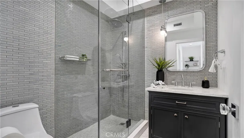 Both bedrooms are generously sized, with well-appointed bathrooms featuring sleek tilework and modern fixtures. Sliding doors lead to a private outdoor patio and yard, creating a peaceful retreat for dining, relaxing, or working outdoors.