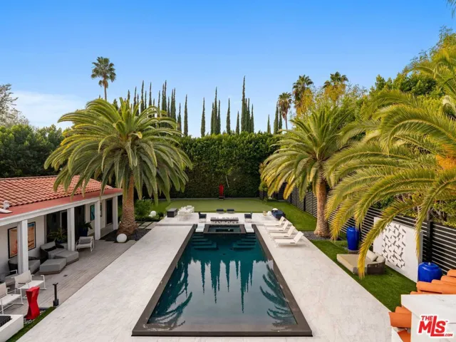 Supremely private Stately gates with imposing 25′ high hedges hide a true miracle of a home that serves as the ideal host for fantastic entertainment. State of the art Movie theater. State of the art Golf Simulator with cigar lounge that has humidifier filtration for fresh clean air. Bold designer choices abound – gorgeous on-trend fixtures and dynamic wallpaper coverings. Two downstairs en suite bedrooms, two other upstairs en suite large bedrooms. Another bedroom converted into a complete spa with wet and dry sauna and massage table. The other bedroom adjacent to the Primary suite has been opened to serve as a huge killer office. Upstairs laundry has been added to complement the downstairs laundry off the secondary staircase. This is truly a luxurious floorplan. La Cantina folding doors open to reveal an immaculate backyard that blows you away. Placid infinity pool reflects the subtle exterior lighting with various daybeds and conversation lounges surrounding cozy fire pits. The outdoor kitchen offers a veritable restaurant experience with the pizza oven, fireplace, TV and bar.