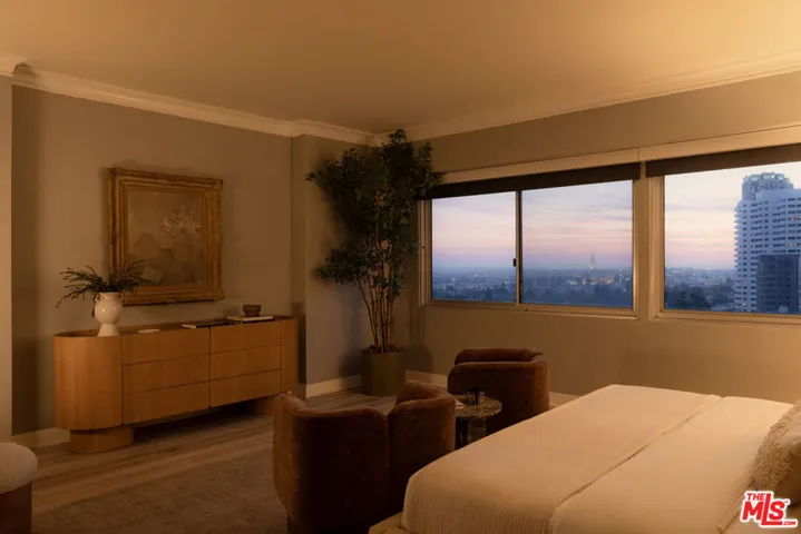 Welcome to The Churchill, a full-service Mid-Century building on the Wilshire Corridor, where this expansive 12th-floor residence enjoys sweeping southwest views and a tranquil rear location. Wake up to remarkable vistas stretching toward the ocean or enjoy dinner on your balcony as the sun sets over the Corridor. This completely remodeled home features one bedroom, one bathroom, and an open-plan living and dining area. The updated and expanded cook’s kitchen includes Caesarstone counters, stainless-steel appliances, in-unit laundry, and additional cabinetry with a wine refrigerator, all opening to a sitting area, dining space, and the main living room. The oversized bedroom offers abundant space for both a desk and a sitting area. The Churchill is a pet-friendly building, welcoming cats and small dogs. Amenities include 24-hour security, valet parking, a fitness center, sauna, recreation room, extra storage, and one of the best pools on the Corridor. HOA dues are $1,281 per month and include all utilities, cable, and building amenities. Centrally located near UCLA and Westwood Village.