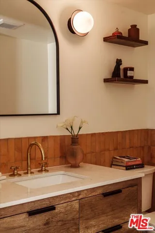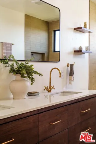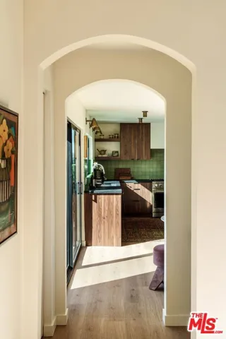 Spectacular Spanish home by Decente Designs perched at the top of the hill with incredible natural light and panoramic views from every room. Flanked by greenery and gardens with exceptional privacy, the main level is elevated off the street and features a reclaimed antique entry door with iron hardware. Enter into the designer remodeled home to find all new flooring, bespoke light fixtures, all new finishes, stunning views out every new Milgard window, with thoughtful and stylish touches throughout. The kitchen features granite countertops, walnut cabinetry, Rejuvenation bronze hardware, Zia tile backsplash and island tile, brass light fixtures, all new appliances, accented by open shelving and plentiful natural light. Off of the kitchen opposite the sitting area is a built-in breakfast nook looking out to the large deck through a sliding glass door with room for al fresco dining and lounging overlooking the expansive hillside views in complete privacy. Through the arched doorways there is a formal dining room complete with fireplace clad in stunning cotto tile, and adjacent to that a classic step down living room featuring another fireplace with custom tile shelving and flanked by wall sconces and large windows. Upstairs the bedroom level features a built-in sitting nook under a view window at the top of the staircase, and a generous primary bedroom with its own balcony, walk-in closet, and en suite bathroom. The primary bathroom is highlighted by limestone flooring, custom cement tile shower with brass hardware, and a double vanity with artisanal light fixtures. The three guest bedrooms and additional guest bathroom, all with stunning views, complete the bedroom floor. Downstairs there is a den off of the larger second deck which has a tiled built-in exterior kitchen area and built-in hot tub all in complete privacy with 180 degree deep views of the surrounding green hillsides. Direct entry two car garage, secluded yard areas on either side of the home, and just a short drive to markets, restaurants, coffee shops, hikes, and more at the bottom of the hill. A special home in the Los Angeles hills awash in natural light and greenery.