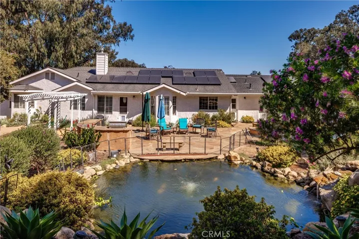 Step outside to your personal oasis, perfect for relaxing, entertaining, or enjoying the outdoors. The expansive backyard features a large grassy area, a garden space, and multiple gathering areas. An outdoor kitchen, cozy fire pit with seating, and a tranquil koi pond with a cascading waterfall set the scene for year-round enjoyment.