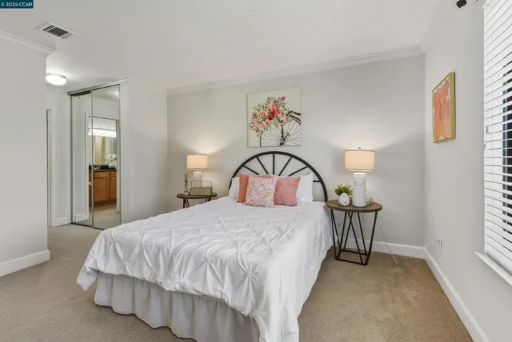 Beautifully maintained Eastridge upper-level condo at the top of San Ramon’s Bollinger Canyon Rd. Gated community w/in a mile of City Center, year-round farmers market, The Marketplace shops, restaurants, Central Park, library, community ctr, Iron Horse Trail. 1074+/-SF. 2 bds w/en suite bathrooms, mirrored closet drs. 2 bathrooms w/single sink vanities, tub/shower combos. Inviting entry. Vaulted ceilings. Fresh int paint. Crown molding. Tile & carpeted floors. Updated central AC (2019). Abundant natural light. Living rm w/wood-burning fireplace, slider to view balcony & storage closet. Dining area, ceiling fan/light. Well-appointed kitchen w/granite counters, richly stained cabinetry, upper glass-faced cabinets, stainless steel refrigerator, new Samsung range, dishwasher & microwave. Front-facing window over stainless-steel sink. Washer/dryer behind closet drs. Multiple storage closets. Updated exterior. Exclusive enclave of condos on park-like grounds. Towering redwoods. Walking trails. App-controlled security gate. Access to 2 swimming pools, spas, gym. Entertain family & friends at clubhouse. Located between Canyon Lakes & The Bridges Golf Courses. Near freeway. Top-rated SRVUSD schools w/in 2 mi. Assigned parking space. Abundant guest parking.