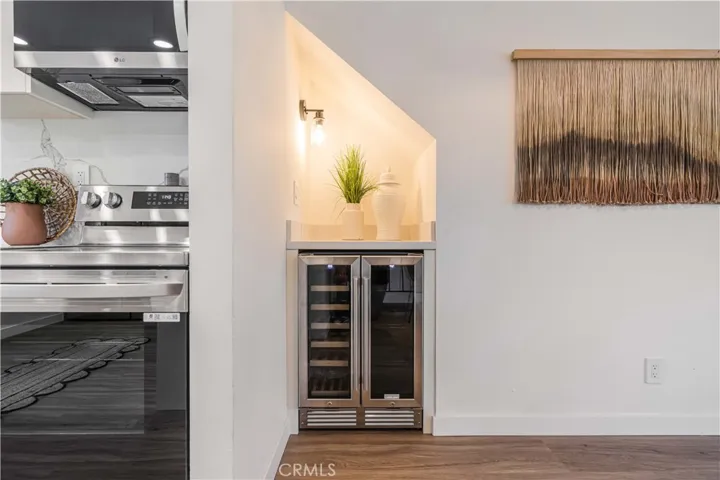 The home offers two bedrooms plus a spacious loft, ideal for a home office, creative studio, or guest space. Two fully remodeled bathrooms featuring curated finishes throughout. The redesigned kitchen anchors the main living area and includes custom cabinetry, quartz countertops, and a full suite of brand-new GE appliances with an induction range and in-unit laundry. A custom coffee bar with a wine refrigerator adds both function and personality.