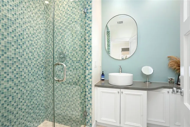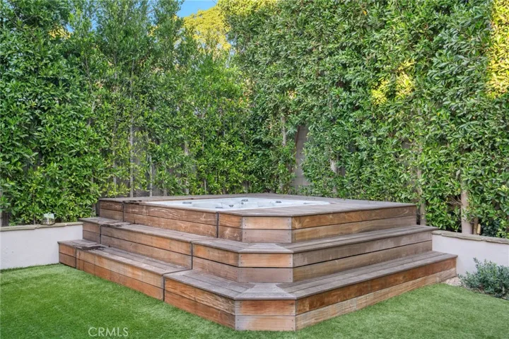 A separate den with a fireplace is styled as a bar and parlor room, offering the perfect setting for entertaining or relaxed evenings at home. The flexible floor plan includes five bedrooms and four bathrooms, with three spacious bedrooms upstairs and two downstairs, including one currently set up as an office—ideal for work-from-home needs or guest accommodations. The primary suite serves as a private retreat, featuring high ceilings, a bay window, two walk-in closets, and a spa-like bathroom with a soaking tub. Outdoors, enjoy a spacious backyard with a lawn, large outdoor dining area, a built-in outdoor bar with grill and wine refrigerator, fire pit, and hot tub—designed for both everyday use and gatherings.