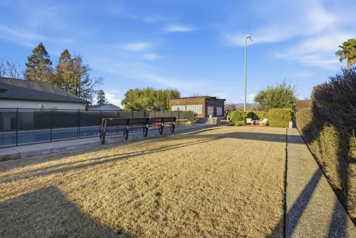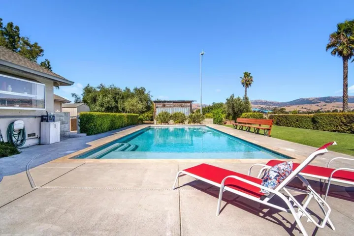 Gorgeous single-story Modern Ranch-House showcasing true pride of ownership. The well-designed open floor plan provides generous living space and features a cathedral ceiling in the living room, bringing an abundance of natural light. The property includes a spacious paver driveway plus additional concrete parking, ideal for oversized vehicles. Inside, enjoy newer flooring and fresh interior and exterior paint. kitchen has been updated with newly painted cabinets and newer stainless-steel appliances. The primary suite offers a cozy gas fireplace and a small lounge area, perfect for relaxing. The 3 car garage features epoxy-coated concrete flooring and workshop. Large Inside Laundry Room, Fire sprinklers, Storage Shed, Green House, Sprinkler System, Turbine Windmill, Solar panels- SunRun Company. Beautiful Outdoors, the pool has been recently re-plastered and includes a newer motor system, Orchard field, Horseshoe Pit, BBQ Area, Patio Deck, Water Tank for Fire Use. Ideal private location near walking trails, Highway 101, and close proximity to downtown Morgan Hill, known for its great restaurants, shopping, and family-friendly seasonal events.