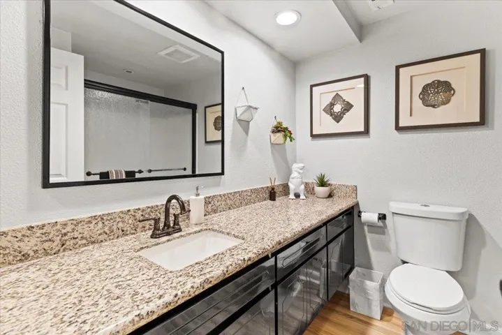 Nestled within the tranquil Stoneridge community of Poway, this beautifully updated single-story townhome offers an exceptional blend of architectural character and modern comfort. Soaring wood-planked, beamed ceilings create an immediate sense of warmth and volume, while the thoughtfully renovated kitchen showcases quartz countertops, designer cabinetry, stainless steel appliances, and generous storage. The expansive living and dining areas are filled with natural light and enhanced by luxury vinyl plank flooring, all centered around a timeless brick fireplace. Oversized dual-pane sliding doors extend the living space outdoors to a private tiled patio overlooking a serene desertscape hillside—perfect for relaxing or entertaining in peaceful surroundings. Inside, two generously sized bedrooms provide ideal separation and comfort, each featuring walk-in closets. The primary suite impresses with cathedral beamed ceilings, dual-sink vanity, extensive cabinetry, and a custom-organized walk-in closet. Additional highlights include recessed lighting, skylight, central air conditioning and heat, dual-pane windows, ceiling fans, and an attached garage with washer and dryer hookups. Residents enjoy access to a sparkling pool and spa, ample guest parking, and an HOA that covers water, trash, sewer, roof and exterior maintenance, and common area care. Ideally located within the highly regarded Poway Unified School District, this home offers close proximity to shopping, golf courses, Bernardo Winery, Lake Poway, and an abundance of scenic hiking and biking trails.