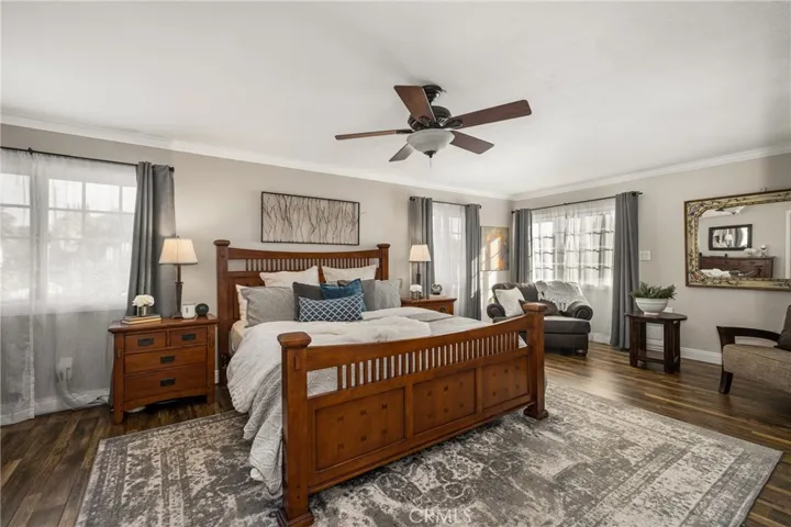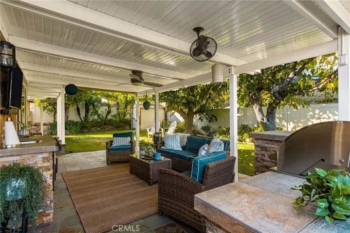 Nestled on a quiet cul-de-sac, this beautifully upgraded 5-bedroom, 3-bath home offers exceptional living with side covered parking perfect for recreational toys or an extra vehicle and RV parking. The open, spacious floor plan is filled with natural light from abundant windows and features a welcoming living room with brick fireplace and surround sound, while the remodeled kitchen shines with white shaker cabinetry, granite countertops, tile backsplash, stainless steel appliances, bay window overlooking the garden, pull-out trash cabinet, and Lazy Susan. Designed for entertaining, the backyard boasts a fully covered patio, built-in barbecue center with stainless grill, sink, and refrigerator, vinyl fencing, fruit trees, two storage sheds, and a tranquil water fountain. The flexible layout includes two primary suites downstairs and one upstairs, both with walk-in closets and beautifully upgraded bathrooms. Extensive upgrades include laminate and tile flooring, crown molding, 5-inch baseboards, new plumbing fixtures, recessed lighting, dual-pane windows and sliders, laundry chute, six-panel doors with new hardware, copper re-pipe, paid-off solar panels, and upgraded electrical panel. The finished two-car garage offers built-in cabinets and pull-down access to a full loft storage area. Ideally located within walking distance to Placentia-Yorba Linda schools and parks, and just minutes from freeways, shopping, and restaurants, this home truly has it all.