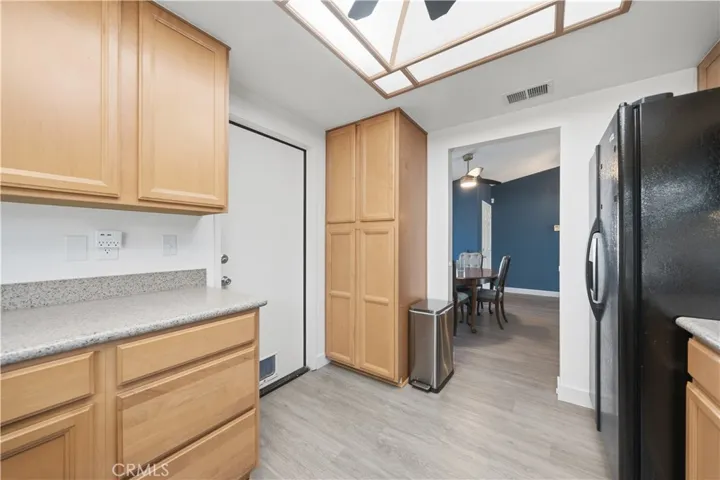 The home offers a warm and inviting layout featuring a spacious living room with a classic brick fireplace and sliding glass doors that open to a tranquil, fully landscaped backyard. Outdoor highlights include fruit trees, and serene mountain views, creating a private retreat for relaxing or entertaining. The kitchen, family, and dining areas are enhanced by light wood flooring, vaulted ceilings, and an abundance of natural light, providing a charming setting for gatherings. The primary bedroom includes dual sinks and a separate storage area for added convenience. Additional features include a two-car garage with a laundry area separated from the main garage space, along with shelving and extra cabinetry for storage. The home sits set back from the street, complemented by a fully landscaped front yard, adding to its curb appeal and privacy.