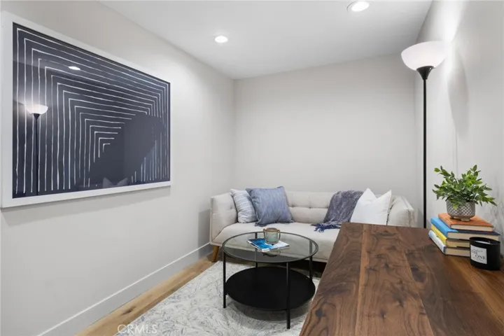 Upstairs, panoramic accordion glass doors invite the outdoors in, connecting the living room, dining area, and bold designer kitchen to a spacious entertaining deck with unobstructed views from the Pacific Ocean to downtown Los Angeles. The kitchen makes a striking impression with natural wood cabinetry, black quartz countertops, stainless steel appliances, and open shelving that blends warmth with modern edge.