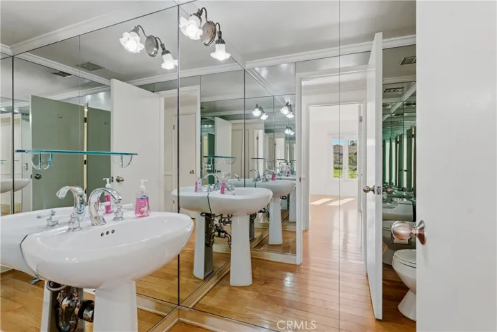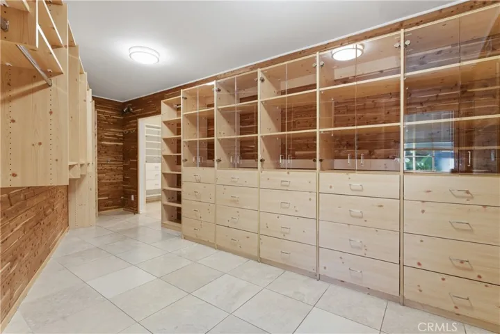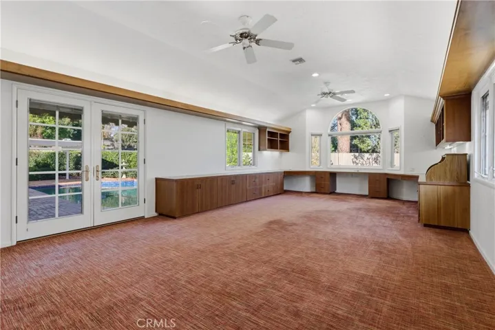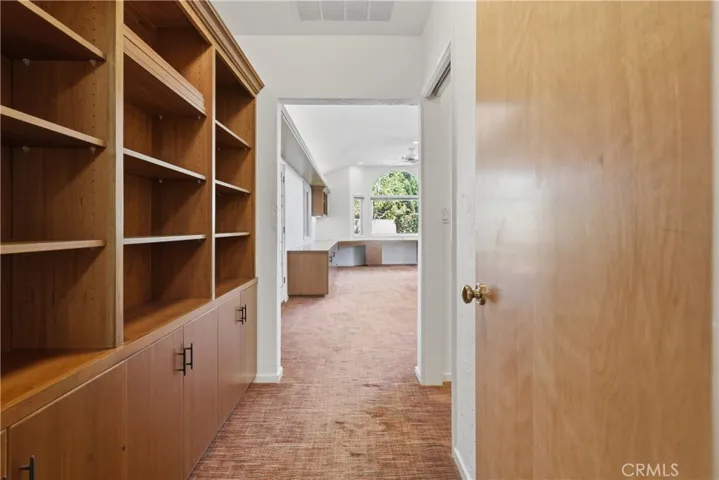 Sprawling single story approx. 4,000 SF gated estate located South of the Boulevard in desirable Vista De Oro at the very end of a quiet cul-de-sac on an almost 19,000 SF lot. The private property sits back from the street behind an automatic security gate & separate pedestrian access. Spacious front yard has rolling front lawn with drought resistant landscaping, mature trees, & long driveway that leads to the 3-car attached garage with built-in storage and direct access. A meandering brick pathway leads to the covered front porch with double door entry. Step inside to find a grand entry foyer with wood beamed tray ceiling, coat closet, & convenient guest powder bathroom. The formal living room has brick fireplace, wood product walls, crown moldings, & French doors that open to backyard. Separate family room features vaulted wood beamed tongue & groove ceiling, brick fireplace, built-in display & storage cabinetry, & French doors that open to the yard. Formal dining room has buffet counter with custom storage cabinetry, gorgeous parquet wood floors, and large picture windows overlooking the exterior. Chef’s upgraded kitchen features large center island, stainless appliances including Miele double ovens, Subzero refrigeration, Viking 6-burner stove + grill, two warming drawers, walk-in pantry, & separate breakfast room with built-in bench seating and expansive storage cabinetry & counter space. Grand primary suite boasts double door entry, French doors that open to the backyard, built-in storage, two oversized walk-in closets with custom built-ins, and luxurious en-suite upgraded bathroom with custom vanity, dual sinks, stone counters, separate makeup vanity, large walk-in shower with dual bench seats & raindrop shower head, & separate spa tub with jets. Attached to the primary is a massive bonus room providing ideal flex space for office/gym/5th bedroom featuring French doors that open to the yard, large walk-in closet, and built-in desks & storage. There are three additional secondary bedrooms, two share a large bathroom with walk-in shower and the third has its own bathroom with shower & tub. There is also a laundry room with storage and exterior access. The entertainer’s backyard boasts swimming pool with children’s safety gate, large covered pergola for outdoor dining, separate Saltillo tiled patio with BBQ center, and lush landscaping with grass lawns and fruit trees. Adjacent to Topanga Mall/Village, Warner Center, hiking trails & minutes to Malibu.