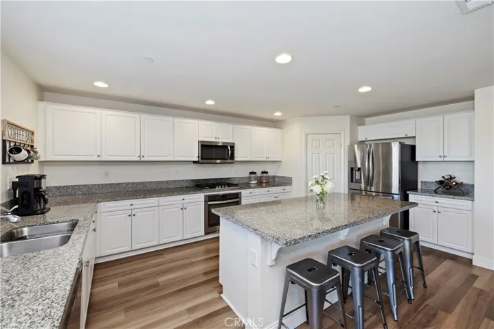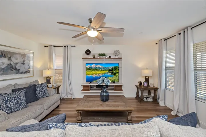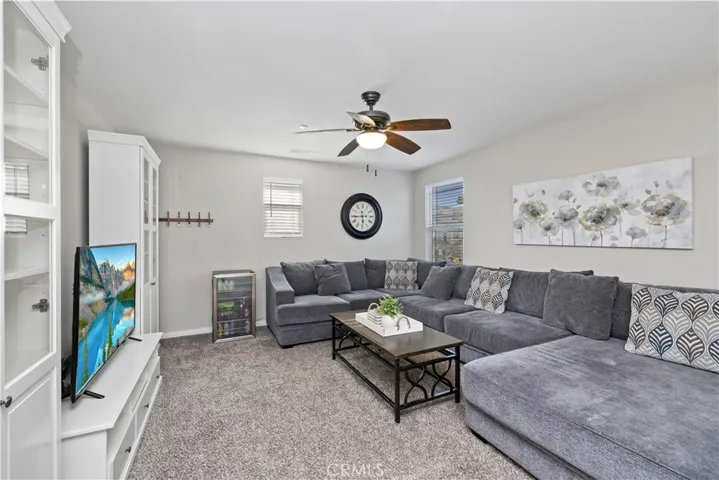 oversize island, storage galore, a homework nook and a walk-in pantry. The family room opens to the private, low maintenance backyard featuring a covered concrete patio for outdoor activities any time of year. The tranquil view of the hills is the perfect backdrop for an evening bar-b-queing and relaxing by the firepit under the ambiance of the outdoor lighting. Ana Verde is one of Palmdale’s most loved communities, with trails, parks, and a neighborly family friendly feel.