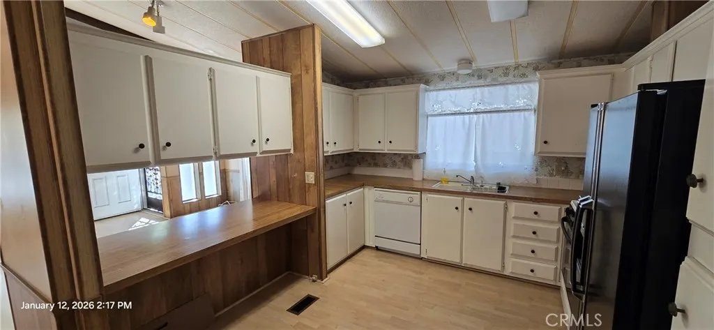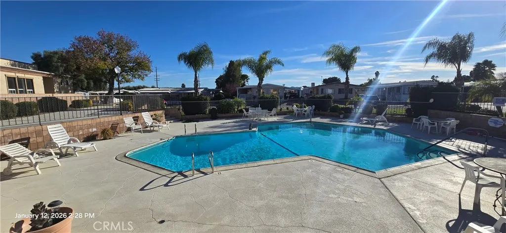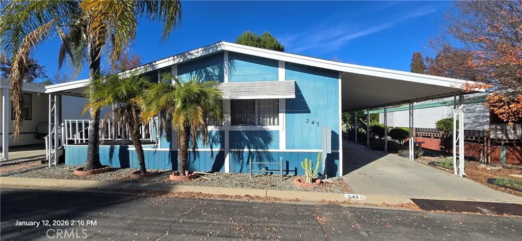 (Unit 247) Great opportunity in this affordable home located in the highly desirable 55+ Community of “Hillside Mobile Home Estates” in Menifee/Sun City! Featuring an open floor plan with high ceilings, laminate wood floors throughout, spacious living room, step saving kitchen with plenty of cabinet & counter space, dining room with built in hutch/cabinets, indoor laundry room, primary bedroom w/separate tub + shower, good size secondary bedroom & full bathroom, and yes this property has central AC & Heat! There’s also a large front porch area and ample room for parking in the carport, and a storage shed! Small backyard area has a few fruit trees too! Community amenities included a beautiful clubhouse with kitchen, billiards rooms, lounge area, shuffleboard, and a gated pool too! Great location convenient to freeways, shopping, and restaurants!