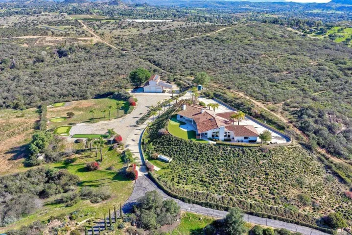 Custom single story Mediterranean estate perched atop your entire neighborhood with forever views! Do you prefer to awe in the beauty of Catalina Island pushing out from the Pacific, snowcapped mountains, or Palomar Mtn, as they’re all options. Highly remodeled chef’s kitchen with Viking/SubZero opens up to the great room with westerly view. Massive primary bedroom suite, and both secondary bedrooms have en-suite bathrooms. In addition to the powder room, there’s a 4th full bathroom with a sauna and access to the outside for when entertaining. Impressive bar just like your favorite pub, and pool table conveys. Below the home, you’ll find a 3 stall “barn” that can house a 45′ RV in the center, and storage in attic is approx 1000 sqft. Aside the barn, there is a hydraulic car lift. Further below the property, you’ll love the 3 golf holes…. bunkers & all….with 3 areas to tee off from, a putting green, as well as horseshoe pits & a bocce ball court. 50+ solar panels are owned/PIF. Lot is 4.04 acres, but below there’s another parcel of 1.28 acres is INCLUDED with the sale! Space to grow a small vineyard or organic mini farm, or whatever your heart desires.