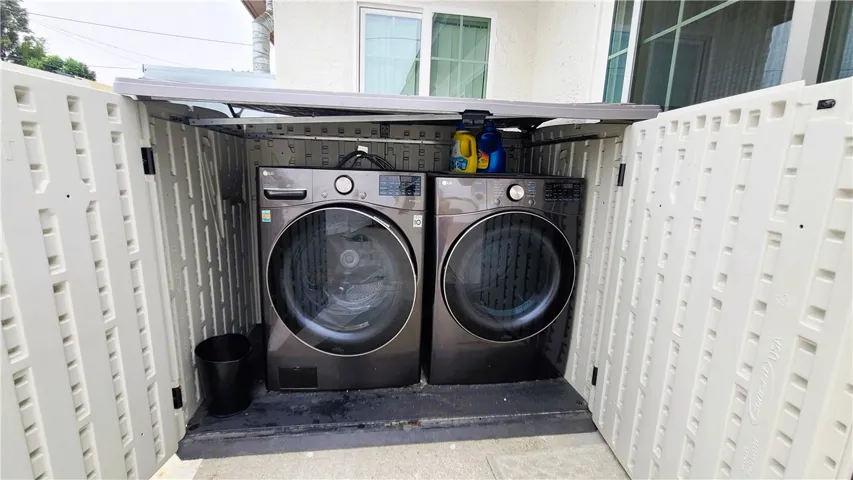 Step outside to a lush, green front yard and a long driveway complete with an EV charger. The enclosed backyard offers a serene retreat, featuring a covered area with a washer and dryer set, ideal for convenience and privacy.