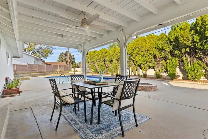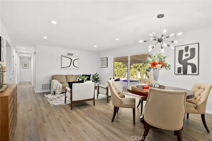 Expansive living spaces open through new sliding doors to a stunning backyard retreat. Designed for elevated outdoor living, the exterior showcases smooth new stucco, fresh sod, desert-inspired landscaping, a large covered patio, custom fire pit, and a newly retiled pool—ideal for hosting or relaxing in complete privacy. The front yard is enhanced with California native plantings and a drought-conscious irrigation system.