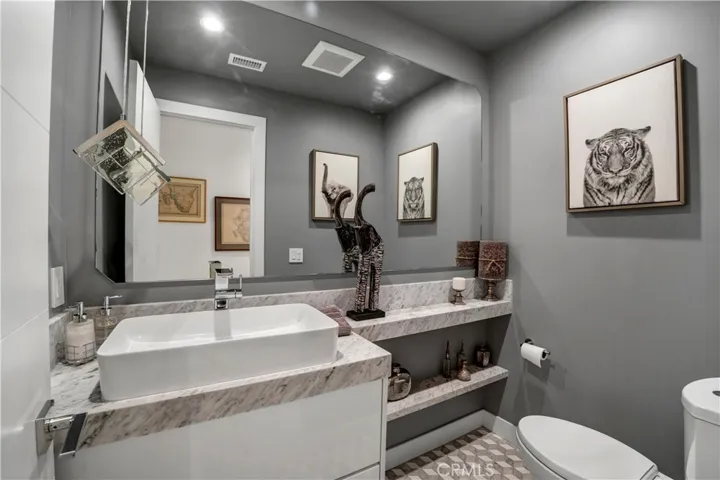 Commanding 180° valley views from a rare elevated perch above Encino with great privacy. Adjacent to the Encino Reservoir and perched to capture sweeping 180-degree panoramas across the San Fernando Valley, the home feels suspended above it all: quiet, luminous, and profoundly private. Spanning approximately 4,755 square feet, this 5-bedroom, 5.5-bath home is a refined contemporary reimagining of its mid-century origins, fully rebuilt in 2019 with exceptional taste and architectural restraint. Walls of glass dissolve the boundary between indoors and out, framing the ever-changing valley below and bathing the interiors in natural light from dawn through dusk. A long, gated approach heightens the sense of arrival. Inside, a dramatic great room unfolds with soaring vaulted, beam-accented ceilings, an oversized statement fireplace, and a built-in bar—an expansive yet intimate space designed for both quiet evenings and large-scale entertaining. The home flows effortlessly to outdoor terraces, where the view remains the constant focal point. The open kitchen is sleek and purposeful, anchored by a generous central island, custom cabinetry, and high-end appliances, with a sunlit breakfast area positioned to take full advantage of the vistas. Multiple ensuite bedrooms provide flexibility for guests, office, gym, or media use, including a sound-insulated den or theater. Upstairs, the primary suite is a true sanctuary, featuring dual walk-in closets, a spa-caliber bath, and a private glass-railed balcony floating above the valley. Outdoors, the property becomes a private hillside resort: wraparound patios, pool with Baja shelf and spa, firepit, outdoor kitchen, lush landscaping, mature fruit trees, and abundant rose gardens. Thoughtfully rebuilt with luxury finishes, fire sprinklers, tankless water heaters, and an attached two-car garage, this is a home where design, engineering, and setting align—minutes from Ventura Boulevard, Mulholland, and the Sepulveda Pass. This is not simply a house with a view, but a rare vantage point above the city.