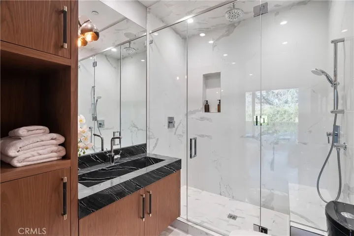 Tucked behind mature privacy hedges on an expansive nearly 18,000 sf lot, this gated, newer construction estate is ideally located south of the Boulevard in prime Tarzana. As you enter through the grand front door, you are greeted to a sprawling open floor plan highlighted by soaring ceilings that carry throughout the home. The sleek, modern chef’s kitchen is equipped with top-of-the-line Miele appliances, a walk-in pantry, massive waterfall island and sun-drenched breakfast nook. An oversized sliding glass door in the spacious family room disappears into the wall, allowing for a seamless flow between the indoor and outdoor living spaces. Completing the main level is a formal living and dining room designed for entertaining, ensuite bedroom, laundry room and bonus room. Ascend the elegantly curved staircase or take a ride in your personal elevator to the upper level, where you will find a large recreation room with direct access to the backyard and four generously sized ensuite bedrooms, each with its own walk-in closet and private balcony. The expansive primary suite features a private sitting room, custom walk-in closet and luxe ensuite bathroom, complete with a soaking tub, rainfall shower and double vanity. A floor-to-ceiling wall of glass floods the primary bedroom with natural light and a projection screen allows you to watch tv from bed. Surrounded by mature privacy hedges, the entertainer’s backyard is a true oasis highlighted by a 50 ft heated pool/spa with a baja shelf and pool house that offers a kitchenette and bathroom. There’s also a large cabana, outdoor kitchen with bar seating, built-in firepit, sports court and ample patio/yard space. Additional amenities include a smart home system with integrated speakers, robust security system, electric pool cover and three-car garage with oversized doors, a car lift and EV charger. Located down the street from Ventura Boulevard, enjoy easy access to excellent shopping, dining and entertainment options.
