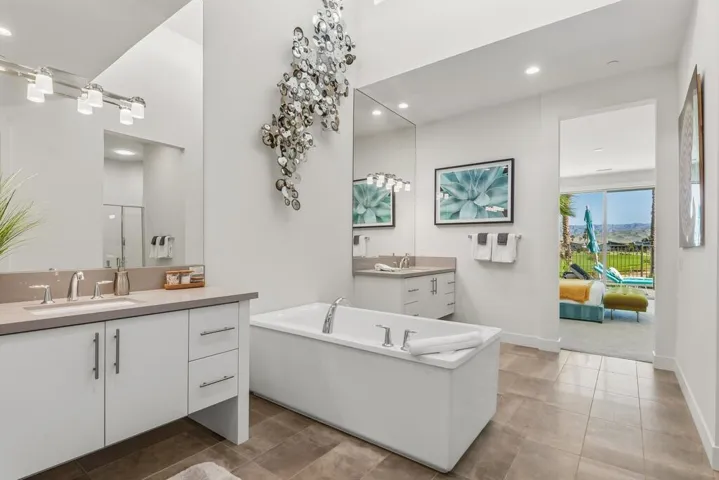 Welcome to your private desert oasis in the heart of Palm Springs! Located within the prestigious guard-gated Escena Golf Club community, this stunning contemporary residence showcases modern elegance, thoughtful design, and breathtaking views–perfectly capturing the essence of desert living. Vaulted ceilings and soaring 10’+ ceiling heights enhance the open-concept floor plan, while expansive windows flood the home with natural light. Sleek porcelain tile flooring runs throughout, complementing the clean architectural lines and custom lighting. The living area is anchored by a cozy fireplace, creating a warm and inviting space for relaxing or entertaining. The chef’s kitchen is a true showpiece, featuring quartz countertops, custom white cabinetry, stainless steel appliances, and an oversized island ideal for gatherings. Designed for comfort and privacy, the home offers two ensuite bedrooms, including a spacious primary suite with room for a sitting area, sliding doors to the backyard, and a spa-inspired bath with dual sinks, a freestanding soaking tub, and a stunning walk-in shower. A versatile bonus room with a king-size Murphy bed functions beautifully as a home office, media room, or additional guest bedroom. Step outside to your resort-style backyard, where a sparkling private pool and spa, large firepit, and panoramic views create the perfect setting for both lively entertaining and peaceful evenings. Golf enthusiasts will love practicing on their very own putting green. This home is as smart as it is stylish, featuring motorized shades, smart-home technology, and a Sonos sound system throughout. Owned solar panels provide energy efficiency and make the home Tesla charging-ready in the two-car garage. Escena is one of Palm Springs’ most desirable golf course communities, offering low HOA dues, fee simple land (you own it), and a championship Nicklaus-designed course, all just minutes from downtown Palm Springs dining, shopping, and entertainment. This exceptional contemporary home delivers luxury, comfort, cutting-edge technology, and some of the best views in Escena–a rare opportunity to own a true Palm Springs gem.