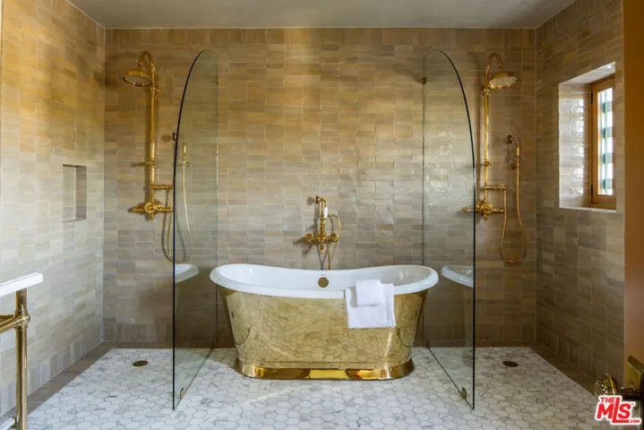 Paul Williams, AIA, Spanish Colonial Revival situated on Eagle Rock’s illustrious Hill Drive. This home is a rare and remarkable offering, rich in pedigree, privacy, and timeless elegance. Originally built in the 1930s, this storied estate has been lovingly restored by Gary Mkrtichyan of Opus Builders, blending old-world craftsmanship with modern-day refinement in perfect harmony. From the exterior, the home evokes the romantic grandeur of Spanish Colonial Revival architecture, with graceful archways, ornate wrought ironwork, hand-carved wood details, vibrant tilework, terracotta rooflines, and lush, manicured gardens spread across nearly three-quarters of an acre. A stately four-tiered fountain greets you upon arrival, guiding you to a beautifully restored wood door that hints at the magic within. Inside, a soaring vaulted ceiling with hand-stenciled wood panels and exposed beams immediately captures the eye, a breathtaking tribute to Paul R. Williams’ signature artistry, an exquisite blend of architectural poetry and old Hollywood glamour. The generous living room unfolds into a stunning kitchen and formal dining room, designed for both intimate dinners and grand celebrations. At the heart of the kitchen is an oversized center island overlooking a dramatic 12-burner La Cornue range. Custom cabinetry, a wood-paneled refrigerator, built-in wine fridge, and a secret walk-in pantry elevate the space with effortless grace and functionality. French bi-fold doors reveal a resort-style backyard where romance lingers in every detail, from the herringbone-tiled pool and spa to the fire pit and winding garden paths that invite quiet reflection beneath the stars. Just beyond, a private sports court adds a playful, spirited contrast to the tranquility, while an expansive grassy lawn, multiple seating areas, and mature trees, including a majestic oak, offer a sense of serenity and space rarely found. Just off the main living area lies a quiet retreat: a formal study and adjoining office, wrapped in rich wood paneling that radiates warmth and sophistication. Magnificent chandeliers cast a golden glow over each room, while French doors reveal an enchanting rose garden that gently winds down to an enclosed greenhouse, a dreamy setting for sunlit lunches, afternoon tea, or moonlit cocktails. Upstairs, a staircase adorned with original tile and wrought iron detailing leads to the spectacular primary suite. Here, a fireplace adds warmth and charm, while French doors open to a wraparound balcony with sweeping views of the grounds. The luxurious bathroom, complete with dual showers and a gold-plated soaking tub, invites indulgence. Three additional bedrooms, two bathrooms, and a second laundry room with access to a private sundeck above the three-car garage complete the upper level. A guest bedroom and bath on the main floor provide comfort and privacy. On the lower level, a hidden treasure awaits. Known as The Velvet Room, this authentic Prohibition-era speakeasy seems to echo with stories from another time. With secret rooms, a built-in bar, a fireplace, and private access to the backyard, it’s a moody and unforgettable escape, where the spirit of the Jazz Age still lingers in the air. From sun-drenched interiors to hidden corners of enchantment, this is a home built not just to impress, but to inspire. With architectural legacy and emotional depth, this is more than a residence. It’s a legend reborn. And for the first time in generations, its doors are opening.