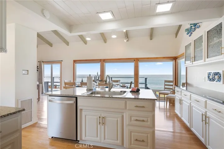 Set along an oceanfront bluff in the desirable Sea Clift Estates, this beautifully newly renovated single-level coastal home offers sweeping, unobstructed views up the coastline and an exceptional sense of space and tranquility. Featuring four spacious bedrooms, 2 full en suite bathrooms, one 3/4 bath and a conveniently placed half-bath, the home is thoughtfully designed for comfort. An open single-level floor plan and soaring beam ceilings breathe freedom into every corner while expansive windows showcase the Pacific from nearly every angle. Enjoy indoor-outdoor living with a large ocean-view deck, private patio, and a new extra large Jacuzzi hot tub, perfect for relaxing while taking in the fresh sea air and dramatic sunsets. A separate den provides flexible space for lounging, entertaining, or working from home, making this property ideal for extended stays or a serene coastal retreat. A rare opportunity to own a true bluff-front home on Cambria’s sought-after coastline. Just a few of the new items: 2 furnaces, washer and dryer, both with pedestals, refrigerator, double ovens, microwave oven, range hood, fireplace insert, en suite Jacuzzi bathtub, toilets, outdoor barbeque grill. Move-in ready with furniture and furnishings included!