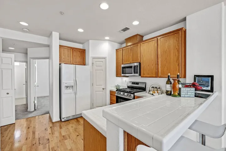 Welcome to this turn-key, move-in ready townhouse-style condominium located in a secure, gated City Center community. This desirable 3-bedroom, 2.5-bath home features gleaming wood floors, fresh interior walls paint, and a cozy wood-burning fireplace in the living room. A sliding glass door opens to a small step-out balcony, perfect for enjoying fresh air or a brief outdoor break. The open-concept kitchen includes refrigerator, dishwasher, new stainless steel appliances—stove and microwave—along with a walk-in pantry, breakfast bar, and dining area, ideal for everyday living. Enjoy the convenience of in-unit laundry with built-in cabinets; washer and dryer included. A charming front gated porch/patio provides additional outdoor space. The attached spacious 2-car garage offers ample storage, including storage room under the stairs. For your visitors, guest parking available inside the community. Prime commuter location to major high tech companies, close to parks, BART station, public transportation, restaurants, farmers market, shopping, supermarket, library, and City Center amenities—ideal for owner-occupants or investors seeking low-maintenance urban living.