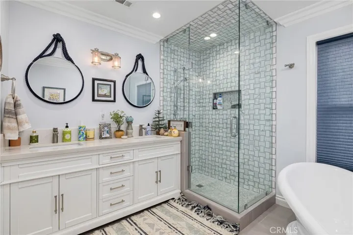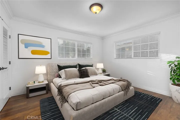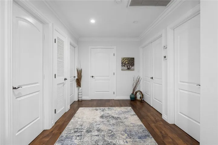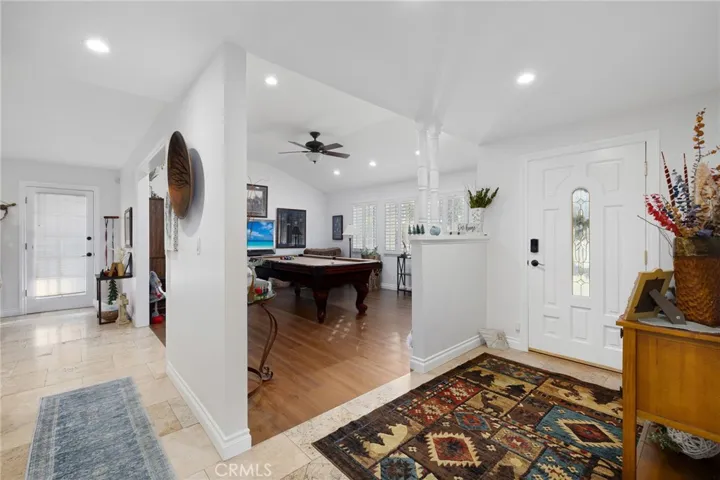 Beautifully remodeled single-story residence on iconic Euclid Avenue, featuring paid solar and exceptional curb appeal. The meticulously landscaped front yard showcases brand-new artificial turf, illuminated planters, a covered pull-through drive leading to a private motor court and attached two-car garage, and a welcoming covered front porch. The home opens to a travertine-tiled entry and front living room with vaulted ceilings, recessed lighting, LVP flooring, plantation shutters, and an open connection to the family room. The family room offers travertine flooring, recessed lighting, a fireplace with mantel, and seamless flow into the kitchen. The kitchen features custom wood cabinetry with glass upper displays, granite countertops, stainless steel appliances, a walk-in pantry, and a peninsula with countertop seating and pendant lighting. Just steps away, the spacious dining room is highlighted by a wall of windows overlooking the backyard. An oversized laundry/mudroom provides abundant storage, natural light, and French doors leading outdoors. Down the extra-wide hallway, the primary suite is accessed through double entry doors and features wood-patterned tile flooring, recessed lighting, crown molding, plantation shutters, and French doors opening to the backyard. The spa-inspired primary bathroom offers dual sinks, a soaking tub beneath a chandelier, a dramatic full-height tiled accent wall that flows into a custom shower with frameless glass enclosure and dual shower heads, and a large walk-in closet with built-in organizers. Three additional bedrooms, all with crown molding, are served by a completely remodeled hall bathroom featuring dual sinks, a custom-tiled shower with frameless glass enclosure, and a freestanding tub. The attached garage is fully finished and includes flush-mount lighting, an EV charger, and attic access with pull-down ladder and overhead storage. The backyard is designed with brand-new artificial turf, stacked-stone perimeter walls, custom lighting, a built-in barbecue, an above-ground spa, and a garden area with mature fruit trees. A cul-de-sac alley provides access to an automatic gate leading to a spacious RV parking area with two storage sheds, separated from the main yard by vinyl fencing and a gated entry. Additional features include a new roof (May 2025), dual HVAC systems, tankless water heater installed in the attic, 200-amp electrical panel, alarm system, automatic sprinklers, and Ring doorbell.