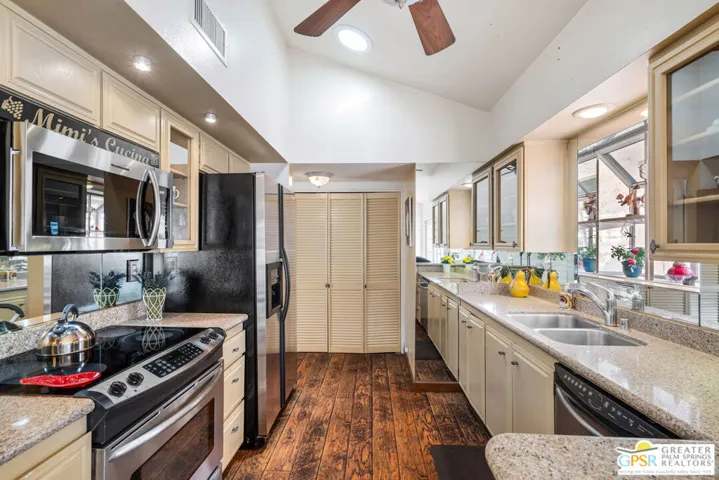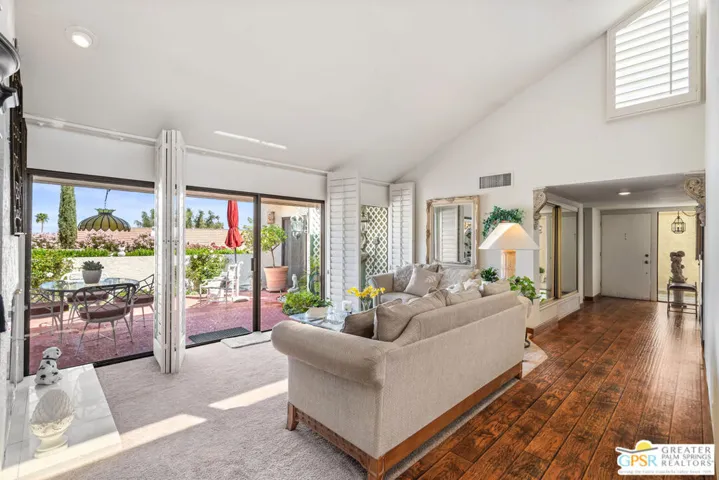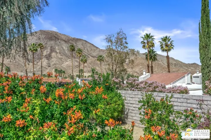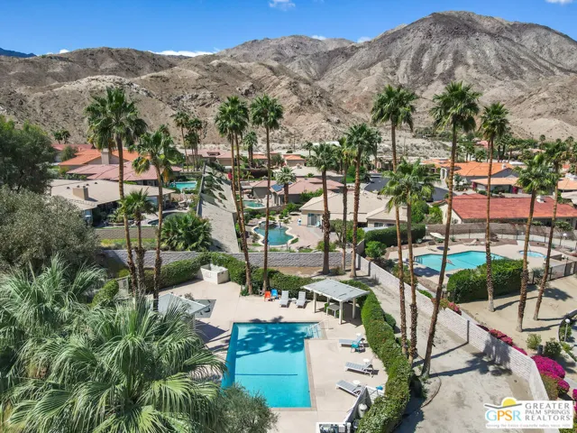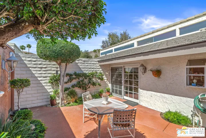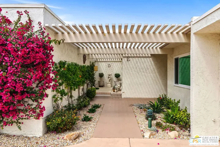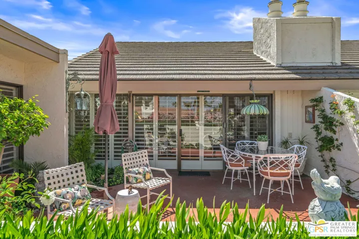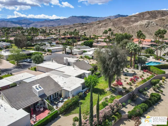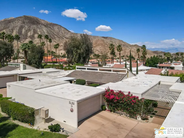 DESIGNED BY RENOWNED ARCHITECT HUGH KAPTUR, a visionary of mid-century modern design, this 3-bedroom, 2-bath condo is located in the architecturally significant KINGS POINT community. Soaring CATHEDRAL CEILINGS, CLERESTORY WINDOWS, and a cozy fireplace in the living room highlight the timeless appeal of desert modernism. With three patios offering a seamless indoor-outdoor lifestyle, the largest which boasts BREATHTAKING MOUNTAIN VIEWS and opens to both the living room and one of the guest bedrooms. A completely private patio connects to the dining area and primary suite, creating a peaceful retreat with direct access to the TWO-CAR GARAGE. A third, smaller patio offers a quiet space for morning coffee or evening unwinding. The sizable kitchen provides generous counter space and storage, perfect for anyone who enjoys cooking or hosting. In the primary suite, you’ll find a spacious walk-in closet and an en-suite bath. Two additional bedrooms and a second full bath offer comfortable accommodations for guests or family. Out front, a welcoming courtyard with desert landscaping enhances curb appeal while remaining low-maintenance. KINGS POINT residents enjoy RESORT-STYLE AMENITIES, including sparkling POOLS, TENNIS COURTS, and expansive GREENBELTS all set against a dramatic mountain backdrop. A rare opportunity to own within one of Palm Desert’s most iconic architectural communities.