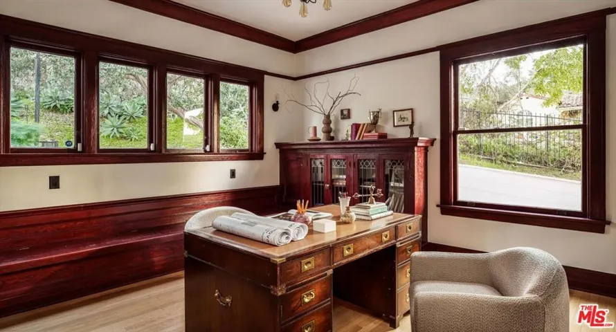 Historical Cultural Monument No. 849. This architecturally significant residence, known as The Nickel-Leong Mansion (1905), was designed by John C. Austin, architect of the Griffith Observatory and Los Angeles City Hall. Perched on a Mt. Washington hilltop, this extraordinary Greek Revival estate showcases immaculately preserved architectural details including hardwood floors, crown moldings, built-in benches and bookcases, and exquisite millwork, the kind of character and craftsmanship rarely found today. Framed by historic and rare Bunya pine trees, the neoclassical facade opens to a sunlit interior with a grand foyer, soaring ceilings, generous rooms, and a classical symmetrical floor plan. The spacious living and dining rooms feature large picture windows with gorgeous views and a focal fireplace in each room. The main level also includes a newly remodeled, vintage-inspired chef’s kitchen complete with stainless steel appliances; a study with original oak millwork; generous hallways; a classic penny-tile bathroom; a large laundry room; a basement; and a separate garage. Upstairs are four generous bedrooms, including a sweeping, sun-soaked primary suite. Ascend a winding staircase to the large finished attic perfect for a creative studio, gym or play space. Set on over half an acre, the property features multiple private decks and outdoor terraces for dining, lounging, and entertaining. Located near the vibrant mix of hip retail shops, restaurants, and art galleries on Cypress Avenue, including Loquat, Cafe Antonietta, Barra Santos, and The Golden Poppy Market.