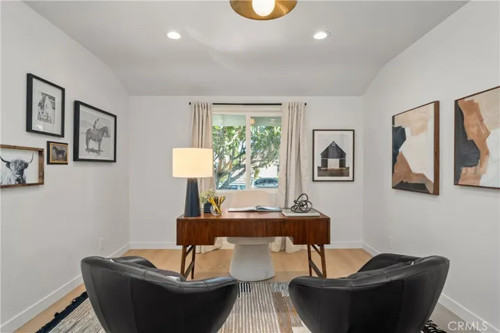 Fully reimagined with intention and care, this beautifully redesigned Valley Village home blends classic Mid-Century inspiration with modern finishes to create a space that feels warm, welcoming, and truly special. Rich walnut cabinetry, handmade statement lighting, and refined brass accents add depth and character throughout, while clean lines and an open layout give the home an effortless flow. Skylights fill the interiors with natural light, highlighting the thoughtful materials and creating a bright, inviting atmosphere. At the heart of the home, the kitchen pairs a sleek slab island, vertical green tile backsplash, and sculptural integrated range hood to form a space that is both functional and expressive. Expansive bifold doors open to the backyard, extending the living space outdoors and making it easy to gather, relax, and entertain. The insulated garage has been thoughtfully converted into a finished flex space, offering approximately 350 square feet of additional usable space ideal for a home office, creative studio, gym, or quiet retreat. Thoughtfully designed and ready for you to make memories