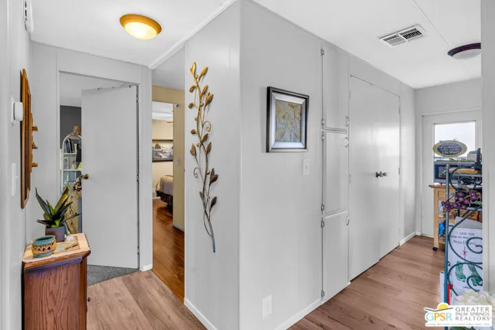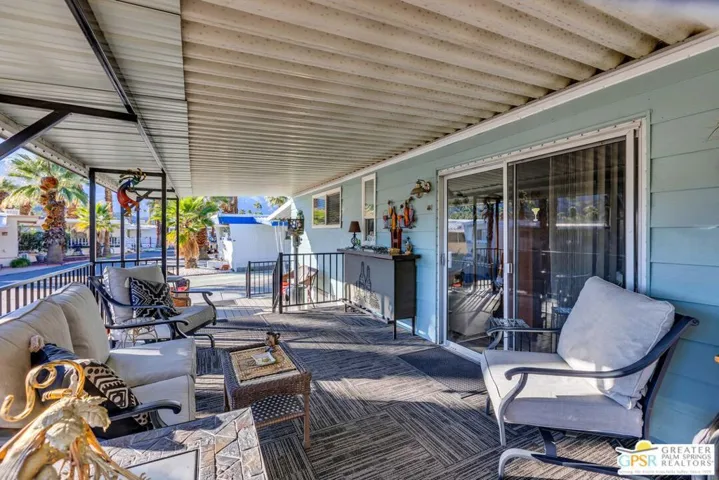 Stylish Traditional Home in Tramview Mobile Home Park. Tucked away on one of the most desirable streets in Tramview Mobile Home Park, this upgraded and well-kept 2-bedroom, 2-bath home offers a serene desert retreat with exceptional charm. Located toward the quiet back end of the community, the property enjoys peaceful surroundings, beautifully maintained landscaping, and paved walkways all framed by sweeping mountain views and vistas overlooking Cathedral Canyon Country Club. Inside, the home features updated bathrooms and a refreshed kitchen, complemented by laminated hardwood floors that add warmth and modern appeal. The standout feature is the expansive two-level, covered outdoor deck, an ideal space for relaxing, dining, or entertaining year-round. Comfort is ensured with central air conditioning and thoughtful amenities throughout, making this an excellent choice for full-time living or a perfect desert getaway. Residents enjoy access to the community clubhouse, ground-level pool, and spa, all included in the HOA. Please note that all future residents must be approved by park management. A clean, contemporary home in a peaceful setting this is low-maintenance desert living at its best. Residents enjoy a beautifully maintained community featuring a large swimming pool and spa, along with a clubhouse designed for entertaining, complete with two full kitchens, a piano, pool table, and multiple card tables for owners’ use. Ideally located near Target, Trader Joe’s, and Starbucks, with Palm Springs International Airport and Downtown Palm Springs just a short drive away, offering effortless access to shopping, dining, and travel.
