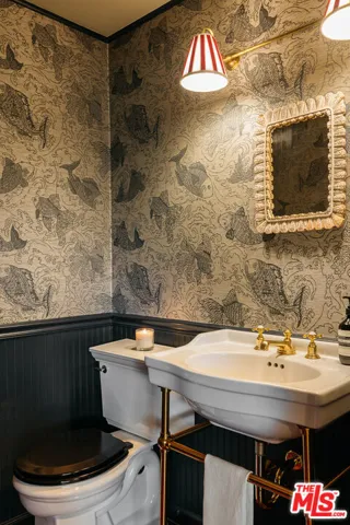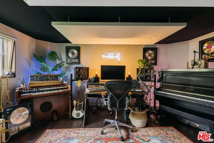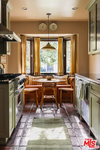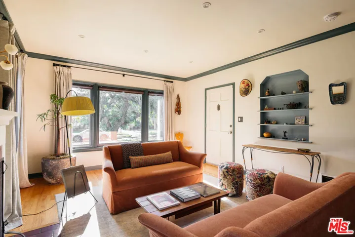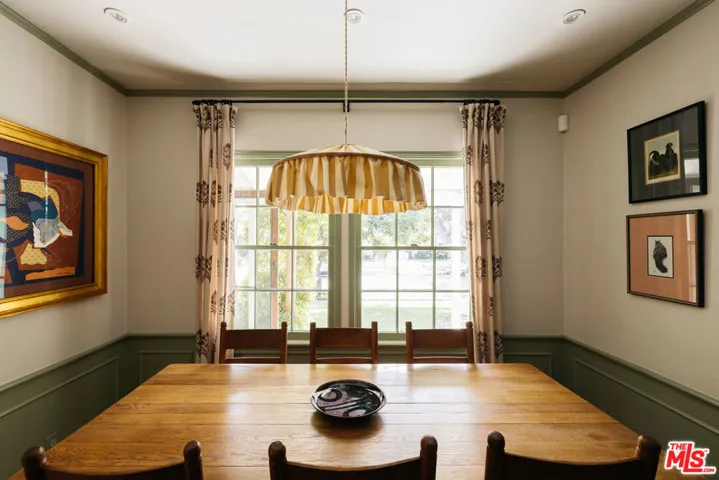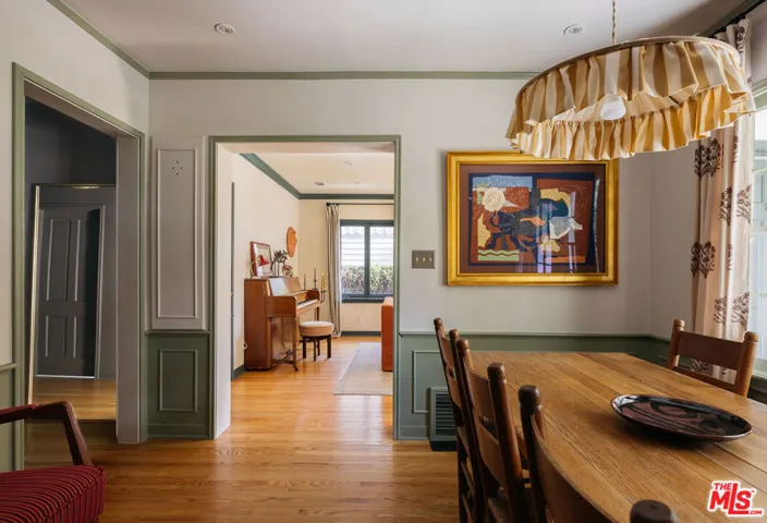 Picturesque traditional modern home with interior design by Garance Rousseau awash in mature trees and greenery with detached recording studio or guest house available now. Stepping past the mature tree and grassy front yard into the home puts you in the living room, featuring original hardwood floors, wood framed windows, and bespoke fixtures. Through the cased transition is the formal dining room with wainscoting that gives way to the kitchen area, all accented with Farrow & Ball paint and detailing. The custom kitchen is framed by picture windows, a built-in breakfast nook, and features stainless steel high end appliances. The bathroom has been renovated with Rosso Alicante marble floor and Fireclay tile walls, Rejuvenation vanity and antique glass knobs, and clawfoot bathtub and shower. The guest bedroom has beautiful wood windows and a door to the backyard, while the primary bedroom has a custom closet with built-ins and room for a king bed. The gated backyard has a covered patio for al fresco dining and a koi pond surrounded by mature plants, vines and fruit trees. Across the small bridge over the koi pond through a door is a fully outfitted approximately 300 sf recording studio or guest house with its own powder room bathroom. It is fitted with hardwood floors and recessed lighting and features a window looking out to the koi pond and greenery, and has its own dedicated mini split HVAC system. The home has central heating and cooling, EV car charger, custom built-out laundry closet, and parking in the driveway for two cars outside the gate. A special oasis near parks, restaurants, Studio City, Toluca Lake, and Burbank.