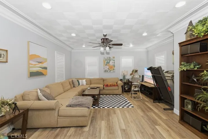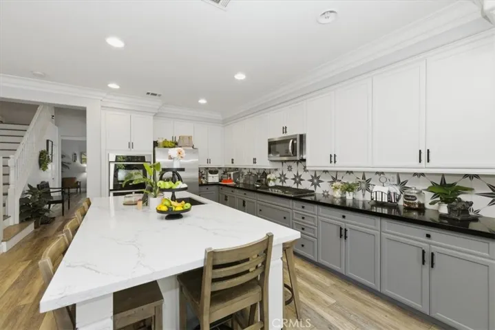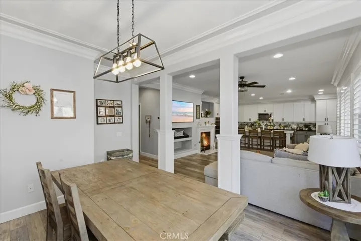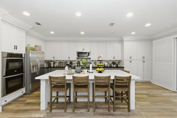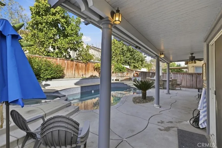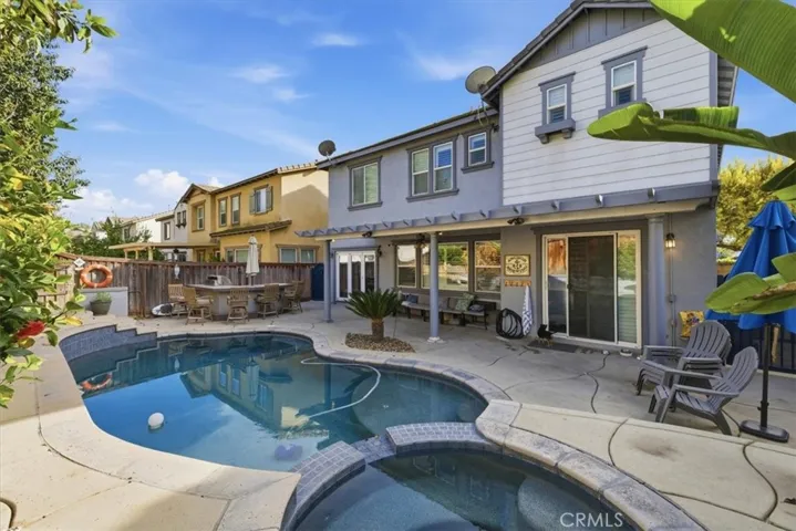 Elegantly remodeled 5-bedroom, 3-bath farmhouse style pool home nestled in a beautiful , growing community near Chaffey College with nearby up-and-coming shopping center and restaurant options make this a highly desirable Chino neighborhood. Every room has been remodeled with extensive upgrades completed in 2021, including all interior and exterior paint and updated flooring. The remodeled kitchen features a custom island and quartz countertops. Upgrades include all new custom black hardware and crystal doorknobs throughout the home, new custom sinks, custom countertops, plantation shutters, crown molding, custom baseboards, shiplap accent walls, custom drywall, and stunning custom ceilings. Spacious floor plan includes a bedroom and full bath with walk-in shower downstairs, a huge upstairs loft/family room, and a primary suite with an oversized double-entry walk-in closet. Triple doors downstairs open the entire wall to the resort-style backyard with vinyl patio cover spanning from one end of the house to the other, private pool, spa, and built-in BBQ. Both front and back yards are beautifully landscaped. In addition to your private pool and spa, the community center boosts a pool, spa and rec-center, with numerous parks in the immediate area. Welcome to your future dream home. It is truly one of a kind.