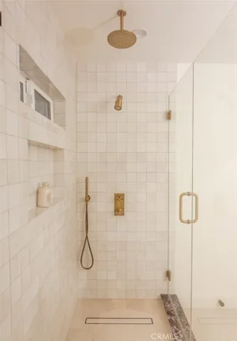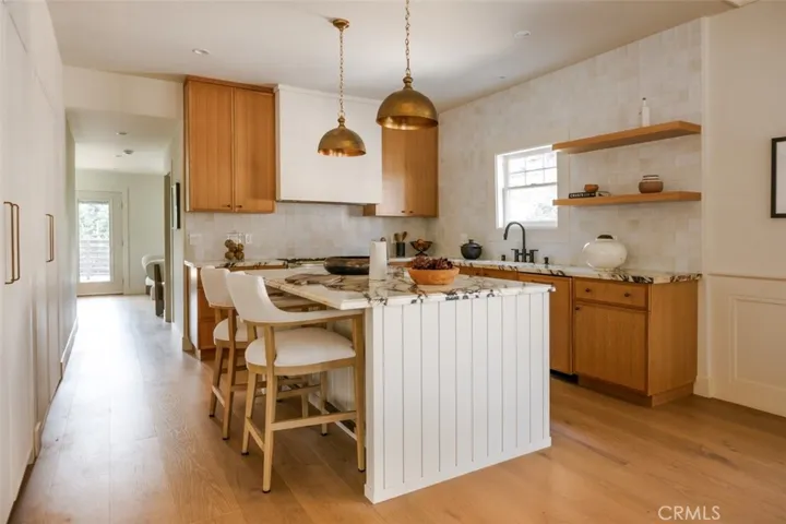 The chef’s kitchen is a true centerpiece, featuring striking Viola marble, custom oak cabinetry, handmade tilework, stone-edged details, built-in appliances, and a spacious walk-in pantry. Upstairs, the primary suite serves as a serene retreat with sweeping skyline views of Downtown Los Angeles, the Hollywood Sign, and the Griffith Observatory, along with a private balcony, custom walk-in closet, and a spa-like bath with dual vanities, handmade zellige tile, a freestanding soaking tub, and a separate shower.