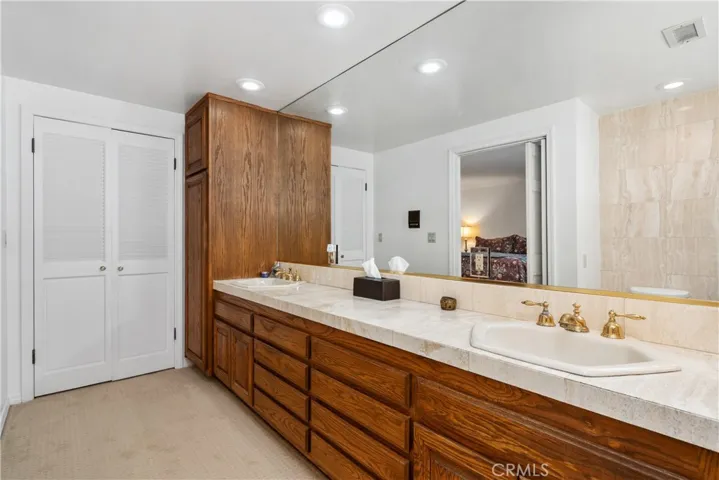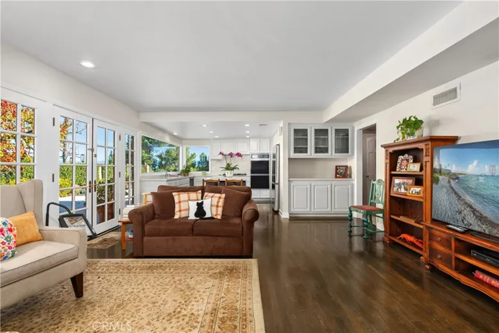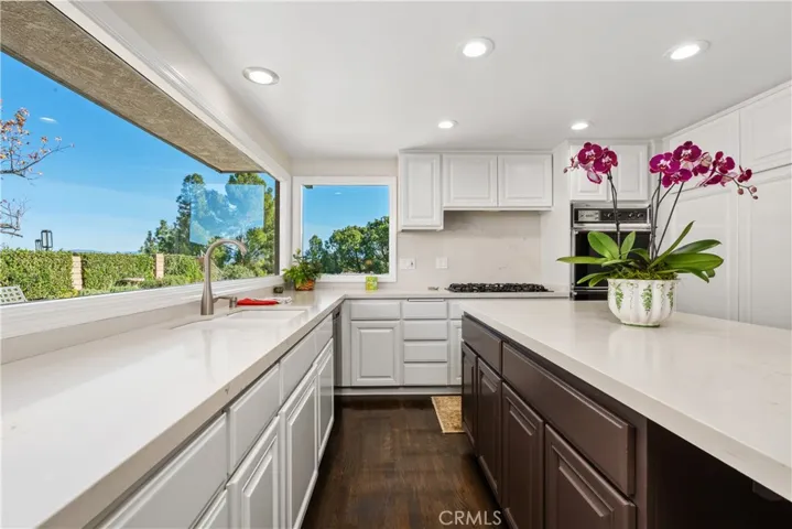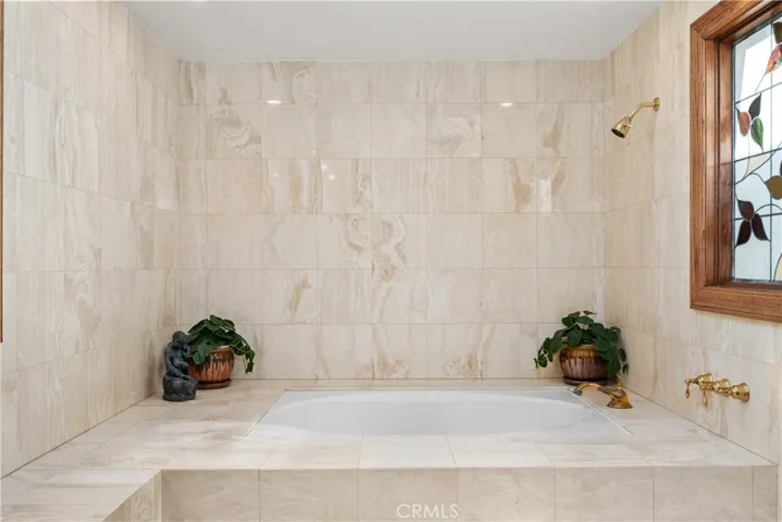This inviting single-story, 4-bedroom, 3-bath residence offers timeless curb appeal and a warm, welcoming presence in a prime South-of-the-Boulevard Tarzana neighborhood. A manicured front lawn, mature landscaping, and brick-accented steps lead to an elegant double-door entry. The home’s low-profile roofline and prominent brick chimney add distinctive character and enduring charm. A wide driveway leads to an attached two-car garage, providing both convenience and ample parking. Thoughtfully maintained greenery and tasteful potted plants enhance the exterior, while the home’s clean lines and balanced façade reflect true pride of ownership. Inside, the light-filled living room offers timeless elegance and generous space for both everyday living and refined entertaining. A soaring vaulted ceiling enhances the sense of openness, while tall windows and French doors bathe the living room in natural light and frame lovely outdoor views. Classic brick accents and a cozy fireplace add warmth and architectural interest. Freshly painted and newly carpeted, the neutral palette creates a calm, versatile backdrop adaptable to any style. Hardwood floors flow from the entry into the family room, creating continuity and warmth throughout the main living spaces. The bright, inviting kitchen features quartz countertops, a double oven, five-burner gas cooktop, abundant counter space, and a center island with breakfast bar. A massive corner window captures breathtaking mountain and city views, making the kitchen both functional and inspiring. Open to the family room, the layout is ideal for entertaining and everyday living alike. French doors open to recently landscaped grounds featuring a large patio perfect for entertaining, artificial turf for easy maintenance, and sweeping mountain and valley views—an ideal setting for both relaxation and gatherings. The spacious primary suite has French doors that open to a light filled atrium, offers multiple large closets and a beautifully updated en-suite bathroom showcasing Italian marble, a soaking tub, double sinks, and stunning stained-glass windows. Secondary bedrooms are generous in size and thoughtfully laid out for comfort and flexibility. Perfectly positioned on a quiet, nearly flat section of Tarrybrae Terrace, this exceptional home offers privacy, tranquility, and an ideal South-of-the-Boulevard setting.