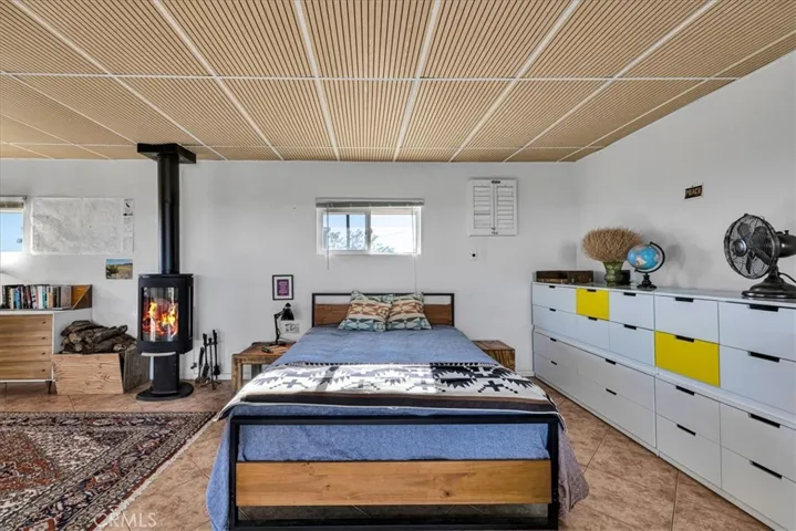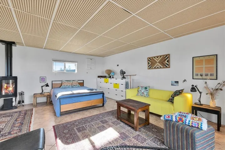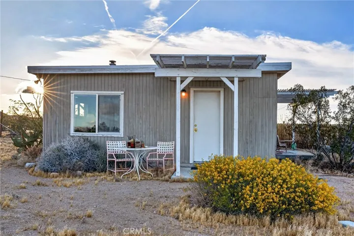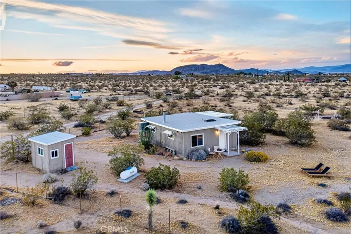 Bordering protected BLM land and set on 2.5 fully fenced acres, this private desert cabin rests in wide-open stillness, where the horizon stretches uninterrupted and the quiet feels expansive. Thoughtfully updated, the 600-square-foot single-family residence blends simplicity and warmth with clean concrete floors, newer appliances, and a skylit kitchen that fills with soft desert light throughout the day. A modern Jøtul woodstove anchors the living space—perfect for cool evenings when the temperature drops and the sky turns indigo. Sliding glass doors open to a covered patio, creating an effortless connection between indoors and out, whether for morning coffee at sunrise or long dinners beneath the fading glow of dusk. An insulated 110-square-foot shed offers flexible space for a studio, workshop, or creative retreat. Sculptural cactus plantings echo the surrounding landscape, and with little light pollution, the night sky unfolds in brilliant clarity—dense with stars and silence. Private, peaceful, and grounded in its natural setting, this property offers the feeling of retreat while remaining just 15 minutes from the restaurants, shops, and entrance to Joshua Tree National Park. A rare balance of solitude, accessibility, and open desert beauty.