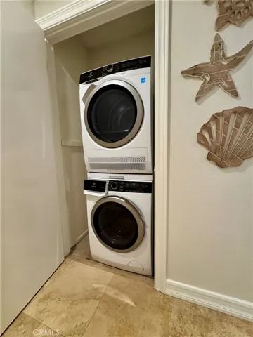 Heated Travertine flooring welcomes you in the entry, kitchen and bath. The kitchen and bath both feature custom solid wood cabinetry paired with granite counters, offering a refined, timeless look. The spacious walk in closet includes built in organizers, cabinets and a cozy seating area that maximizes both storage and comfort. A cleverly designed hidden roll out bed adds flexibility, and the convenience of inside laundry with a stacked washer and dryer makes daily living effortless.