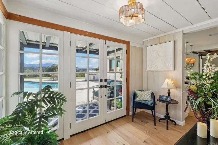 Modern California Farmhouse thoughtfully reimagined to reflect relaxed sun washed living w subtle Spanish influence throughout. Designed to feel elevated yet welcoming the home blends clean intentional lines natural materials black accents and layered textures to create warmth balance and an effortless indoor outdoor lifestyle. Do not let the year built mislead you this is a complete top to bottom remodel combining the craftsmanship and character of a bygone era w modern conveniences buyers expect. At the heart of the home is a spacious chefs kitchen featuring brand new stainless KitchenAid appliances incl a 36in propane gas range w exterior vented hood ideal for everyday living and entertaining. The kitchen opens to expansive layered living and dining areas capturing sweeping inland views north toward Sleeping Indian and east toward Mount Palomar offering beautiful sunrise and sunset vistas. Extensive stamped concrete throughout the driveway walkways and front porch creates a cohesive finished look rarely found on properties of this size. The expansive driveway accommodates approx 20 vehicles ideal for collectors hobbyists large gatherings or business parking needs. Glass front doors frame surrounding views reinforcing seamless indoor outdoor connection. The approach to the front porch is set back behind architectural block walls topped w modern horizontal wood fencing for privacy accented by a bougainvillea lined walkway setting the tone for the California lifestyle throughout. Situated on a rare flat approx 1.5 acre parcel the property offers exceptional outdoor living w remodeled pool and spa expansive deck areas fire pit space and a stunning outdoor kitchen island perfect for entertaining relaxing and enjoying sunsets or star filled evenings. Designer finishes incl wide plank hardwood flooring tongue and groove sun washed paneling custom barn doors and remodeled baths. The primary suite is a true retreat w spacious walk in shower exceptionally large walk in closet and real wood burning stove adding warmth without heating the entire home. The living room features an addl fireplace and walls of windows filling the home w natural light and views. Attached under the existing roofline yet separated by a covered carport is a bonus room approx 12 x 20 offering flexible space for office studio gym or creative use not incl in sq ft. A fully detached 1bed/1bath guest house offers approx 400 sq ft (incl in MLS sq ft) w full kitchen full bath split AC & cozy cottage atmosphere ideal for guests extended family or rental income. Addl outbuildings incl a Quonset hut approx 35 x 12 separate wood structure approx 21 x 11 and storage container approx 8 x 20 offering rare versatility. Fully fenced w two gated entrances accommodating agricultural use equestrian pursuits horses farm animals business ops car collectors or hobby enthusiasts. Addl upgrades incl fresh int and ext paint tankless water heaters and thoughtful improvements enhancing comfort and function. Properties offering this level of privacy flat usable land and flexibility rarely come available a truly special opportunity designed for California living at its best.