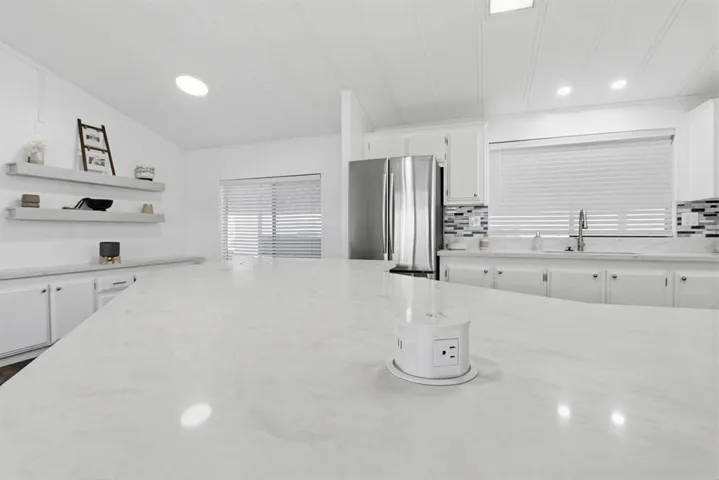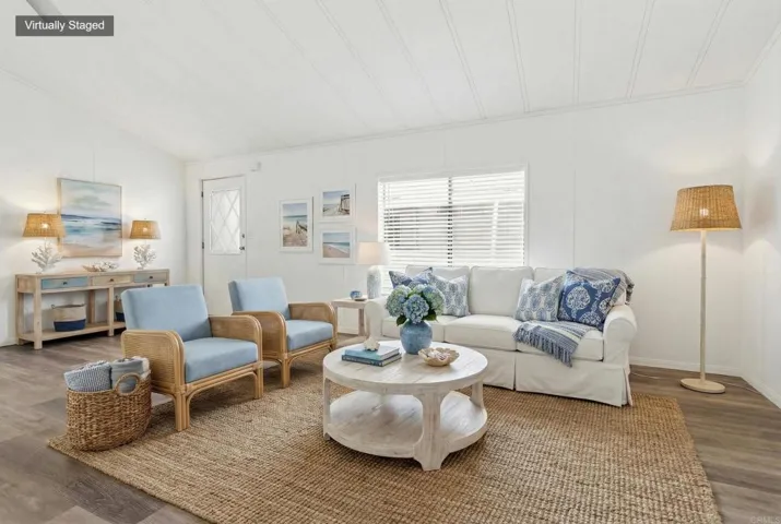 Welcome to your next chapter in this stunning coastal home! Every detail thoughtfully designed to exude modern touches. Step inside and discover a bright remodeled chef-ready kitchen featuring gleaming quartz countertops, sleek white cabinetry, all new stainless steel appliances, new garbage disposal and a brand new island with clever pop-up charging stations for all your devices. Luxury vinyl plank flooring flows seamlessly throughout, creating a cohesive and polished aesthetic. Beautiful canned LED lighting throughout. This charming 3 bedroom, 2 bathroom home has been transformed with modern tasteful upgrades. The spacious living area and dining area offer tall ceilings and a modern ceiling fan. Primary bedroom features spa-like retreat with double vanity, quartz counters, floating shelves, crisp modern lighting with a sleek soaking tub and modern shower features. The guest bathroom showcases a custom shower that elevates everyday routines into something special. Every electrical outlet and light fixture throughout the home has been replaced, ensuring modern functionality meets peace of mind. The dedicated laundry room, tucked behind a stylish barn door, houses a new pedestal washer and dryer set for ultimate convenience with abundant built-in cabinetry and long folding counter. Located in a ALL AGES family park with low space rent of just $503, enjoy amenities like a swimming pool, spa, clubhouse, car wash station and a playground. Just minutes to Oceanside’s beautiful beaches, Pier, Sunset Market, restaurants and Harbor. This newly listed property represents a rare opportunity to own a move-in-ready home with high-end finishes at accessible manufactured home pricing. Schedule your private showing today and discover why this address deserves to be your new home.