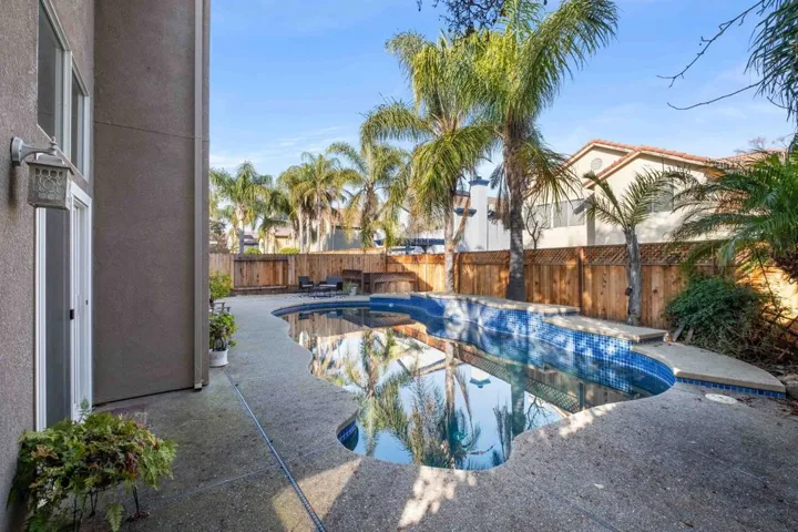 Welcome home to space, comfort, and versatility in this beautifully designed two-story residence tucked away at the end of a quiet cul-de-sac. Offering 5 bedrooms, 3 full bathrooms, including a full bedroom and bath on the main level, this home is ideal for multi-generational living, guests, or a private home office. Step inside to soaring ceilings, abundant natural light from high ceiling windows, and details such as the wood banister and plantation shutters. This floor plan flows effortlessly, with a warm and inviting family room featuring a wood-burning fireplace—perfect for cozy evenings. The spacious kitchen with island overlooks the dining area and family room, creating a true heart-of-the-home feel. Two sliding glass doors lead directly to the patio and backyard, making indoor-outdoor entertaining a breeze. Enjoy views of the pool from the front LR, DR, and kitchen, adding to the home’s open and connected ambiance. A 3-car garage for added convenience & storage. The backyard offers space to relax, entertain & play, complete with a dedicated dog run. Located just steps from a neighborhood playground, with no HOA, this home offers both privacy and community in a highly desirable setting. A great location—this is one you won’t want to miss!