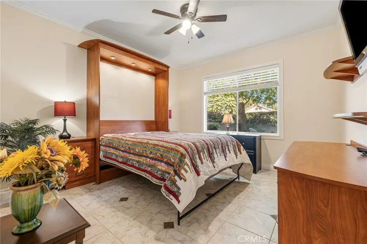 The outdoor space features an extended covered patio and a lagoon-style pebble tech pool and spa, and a misting system on the back patio. The interior is elevated by numerous high-end upgrades, including custom tile flooring throughout, a dedicated laundry room, and a gated front courtyard. The gourmet kitchen is fully equipped with double ovens, including one convection unit, and an electric smooth-surface glass cooktop. Additionally, the home features a unique two-sided fireplace that can be enjoyed from both the great room and the primary bedroom suite.
