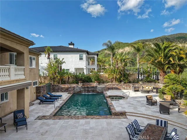 Outside, escape to your private resort-style yard featuring a sparkling pool and spa with cascading waterfalls, outdoor BBQ area and fireplace, and a large retractable awning for shaded comfort—all framed by dramatic mountain scenery. Additional highlights include fruit trees, RV/boat parking, an oversized 3-car garage with extensive storage and custom cabinetry, whole-home generator, and solar panels. Close to great schools including Granada Hills Charter High School, and convenient to The Vineyards and more.
