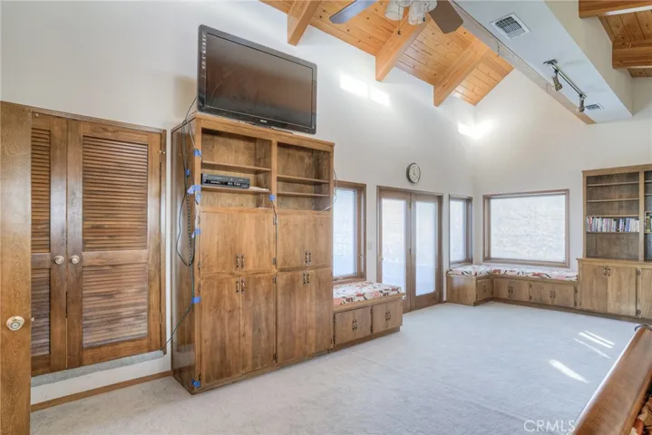 The exceptionally large primary suite includes built-in cabinets and a desk, a generous walk-in closet, and access to a private deck. Four additional bedrooms are well-sized and some include attached bathrooms and built-in cabinetry.