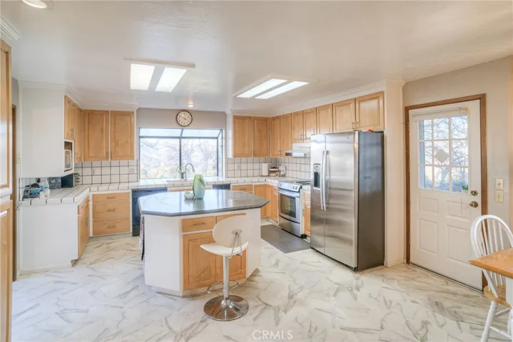 The spacious kitchen offers abundant counter and cabinet space, a large island with a second oven, and a charming garden window that frames beautiful outdoor views. An adjacent eating area provides additional space for casual dining. Just off the kitchen, the inviting family room features a wood stove, built-in cabinetry and bookshelves, and French doors that open to a patio and landscaped picnic area—perfect for enjoying views of the Oroville Dam.