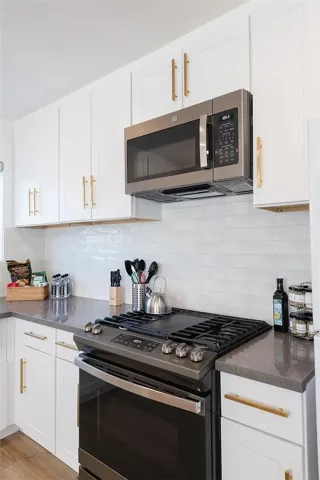 Step inside to discover a light-filled, thoughtfully updated interior featuring a gorgeous sun-drenched kitchen with high-end GE stainless steel appliances, quartz countertops, a farmhouse sink, updated cabinetry, and elegant gold Kohler fixtures. Luxury vinyl flooring runs throughout, creating a modern yet warm feel.
