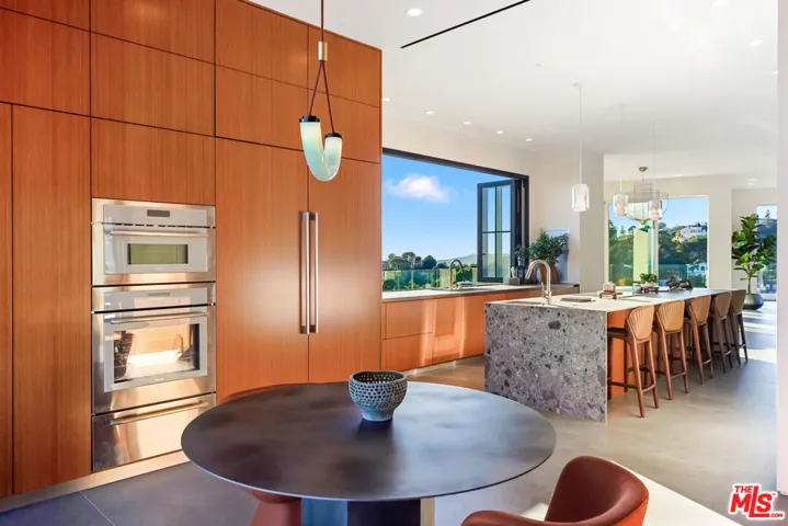 Welcome to The Apex. Perched above the city, this truly one of a kind estate is a statement of vision and refined luxury. Furnished and designed to impress at every turn, the approximately 7,500 square foot compound commands sweeping, unobstructed 360 degree views of the city lights, ocean horizon, and serene canyon vistas creating a constant connection to the landscape and a setting that feels cinematic, private and endlessly inspiring.The main residence features four bedrooms and five baths, where architecture and artistry converge. Custom finishes, museum quality lighting and a thoughtfully curated collection of designer furnishings create interiors that feel elevated, confident and effortlessly livable. Multiple fireplaces anchor the living and outdoor spaces, while expansive walls of glass dissolve the boundary between indoors and out. The living room seamlessly converts into an intimate cinematic experience with a concealed drop down theater, while an elegant yet sultry den opens directly to the outdoors, creating a natural flow for entertaining and everyday living. The primary suite with fireplace and balcony is a true sanctuary highlighted by an all-glass bathroom suite bathed in natural light. The shower is like a fine painting come to life, immersive and sculptural, surrounded by sky, horizon and shifting light. Each additional ensuite bedroom is generously proportioned, offering privacy, impeccable design and endless views.A separate guest house enhances the estate’s versatility and appeal. Designed across two levels, each with its own kitchen and bath, it is currently configured as a gym and lounge, yet can easily serve as additional bedrooms. Ideal for extended guests, multigenerational living, staff accommodations or private entertaining, it maintains complete independence from the main residence.The outdoor experience rivals that of a world class resort, including waterfall entry leading to a rare flat grassy yard, an exceptional find in the hills, especially when paired with panoramic views and privacy. Beyond the lawn, the property unfolds into multiple outdoor living environments including a striking pool and spa, cold plunge, outdoor fireplace, fire pit, BBQ area, wraparound balconies and sexy roof top lounge with fireplace. Every space is designed to capture the scenery as it transitions beautifully from sunrise to glowing city lights at night. A private gated driveway with parking for up to 10 vehicles and garage with elevator to main level further underscores the rarity of this offering. Finding a hillside estate with this level of flat usable land, parking and unobstructed views is extraordinarily uncommon. This is not simply a home, but an architectural experience designed for a discerning luxury clientele seeking something iconic, bold and impossible to replicate.
