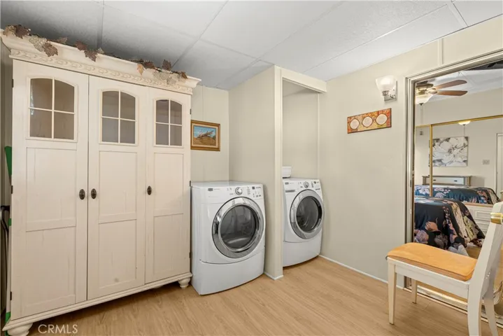 Welcome to Heritage Ranch, a gated 55+ active senior community offering comfort, convenience, and resort-style amenities. This charming 1985 park model with a thoughtfully designed addition offers approximately 700 sq ft of well-utilized living space with stunning views of the San Jacinto Mountains. The upgraded kitchen features updated cabinetry, granite countertops, stainless steel appliances and sink, and a stylish tiled backsplash, complemented by hardwood and tile flooring throughout and ceiling fans for year-round comfort. The spacious bathroom includes an enlarged corner shower, and the home is equipped with a tankless water heater. Additional highlights include an indoor laundry room with storage, handicap ramp access, and an oversized storage shed providing ample space for tools, hobbies, or seasonal items. Washer, dryer, and furniture are included, making this home truly move-in ready. Heritage Ranch offers amenities galore, including a clubhouse, gym, indoor spa, outdoor pool, recreation area, and library, creating an ideal setting for an active and social lifestyle. Enjoy low taxes and a low HOA of $218/month, which includes water, sewer, trash, basic cable, and internet. Conveniently located near shopping and medical offices, this home is the perfect blend of comfort, accessibility, and community.