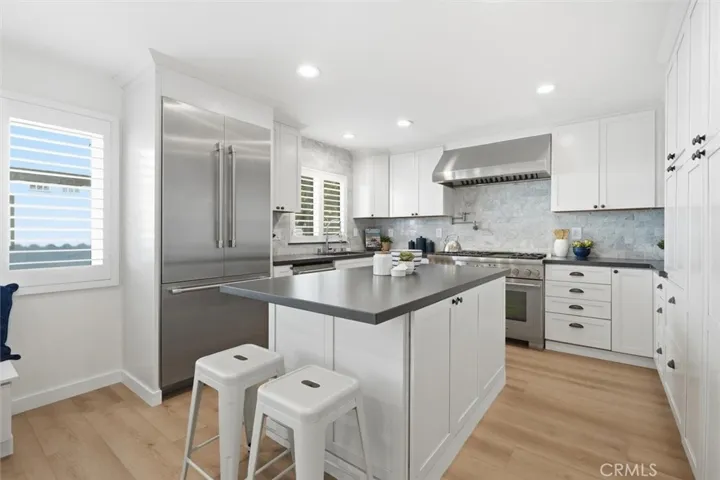 Welcome to your coastal sanctuary in South Redondo Beach. This rare, fully remodeled end-unit townhome is located in a beautifully updated 8-unit complex just steps from the sand and only a few blocks from the shops, dining, and charm of Riviera Village. Designed for exceptional indoor–outdoor living, the home boasts an expansive 1,400 sq ft private yard and patio—a true rarity at the beach—perfect for entertaining, pets, or simply soaking up the coastal lifestyle. With approximately 2,000 sq ft of living space, the residence lives like a freestanding home, sharing only one wall and offering abundant natural light and privacy. The entry-level features direct access to a 2-car garage with EV charger. Upstairs, the split-level living and dining areas impress with 10-ft ceilings, a cozy gas fireplace, and French doors that open directly to the private yard, creating a seamless flow ideal for relaxed coastal living. The heart of the home is the fully remodeled chef’s kitchen, outfitted with Thermador Professional Series appliances, including a 6-burner dual-fuel range, double oven with steamer, soapstone countertops, and custom cabinetry—perfect for both everyday cooking and entertaining at scale. All three bedrooms are located on the upper level. The spacious primary suite features soaring 15-ft ceilings and a serene east-facing private balcony—an ideal spot for morning coffee, ocean air, and the soundtrack of songbirds. Additional upgrades include new flooring throughout, plantation shutters, custom closets, designer paint, and thoughtfully curated coastal finishes. This exceptional home offers the quintessential South Redondo Beach lifestyle—just moments from world-class beaches and surf, top-rated schools, boutique shops, cafés, and the vibrant Riviera Village. A rare opportunity to own a turnkey coastal retreat in one of Southern California’s most desirable beach communities.