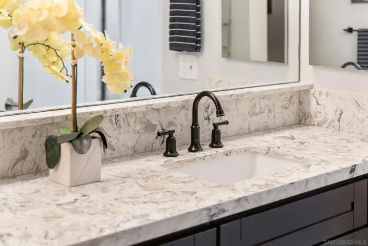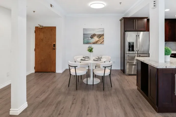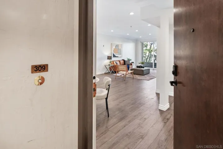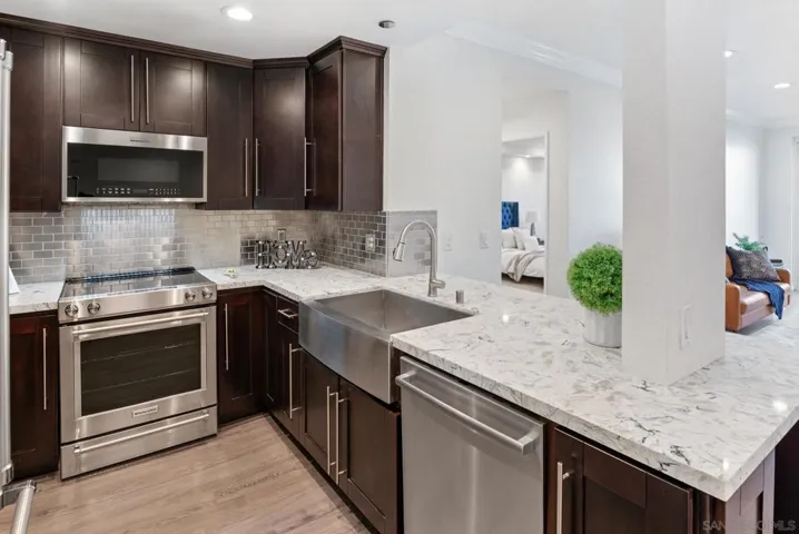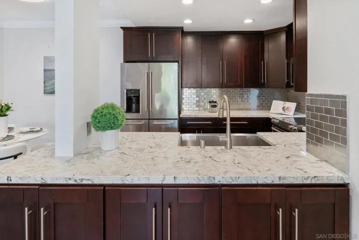 Welcome to luxurious urban living in the heart of Bankers Hill, where this spacious 2-bedroom, 2-bathroom condo offers the epitome of comfort and convenience. Boasting the largest floor plan in the building, this residence is designed for those seeking ample space and modern elegance. Upon entering, you’re greeted by an open layout that seamlessly integrates the living, dining, and kitchen areas with a private balcony and fireplace. The kitchen is a chef’s dream with high-end stainless steel appliances, complemented by a modern farm sink featuring a convenient touchless faucet. Sleek countertops and ample cabinetry provide both style and functionality. Located in highly desirable Bankers Hill, residents enjoy the convenience of walking to nearby attractions such as Little Italy, Balboa Park, and Waterfront Park. The building amenities include a refreshing pool, relaxing jacuzzi, and a well-equipped fitness room, catering to both relaxation and active lifestyles. Both bedrooms are generously sized, each featuring its own bathroom. The primary bedroom offers a luxurious shower, offering a spa-like retreat within your own home. The second bedroom features a jacuzzi tub with shower, a large built-in desk, and a spacious walk-in closet, ideal for those who work from home or need extra storage. Throughout the condo, you’ll find wood laminate flooring, recessed lighting, and crown molding, creating a contemporary ambiance. Two reserved parking spots with additional storage complete this offering, ensuring convenience and security for your vehicles and belongings.