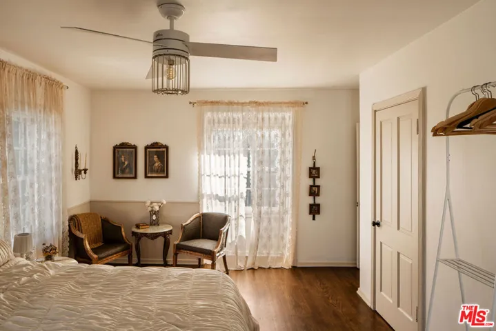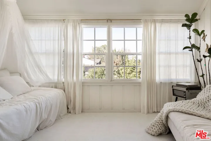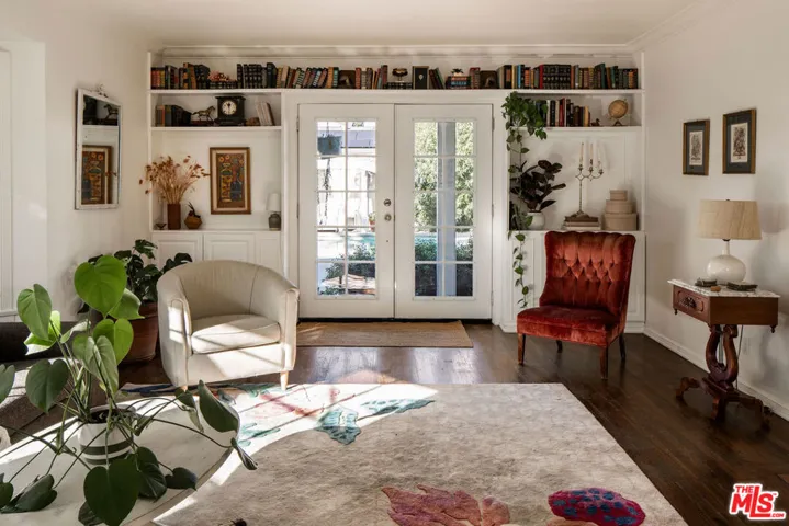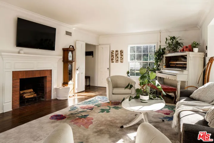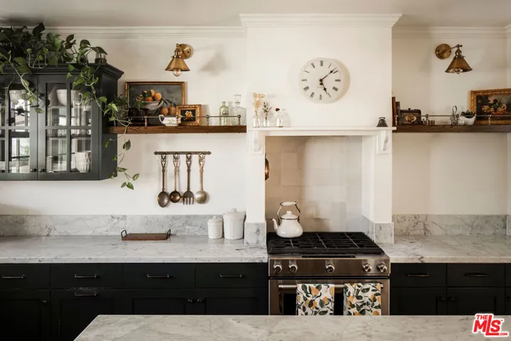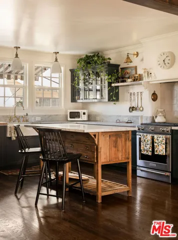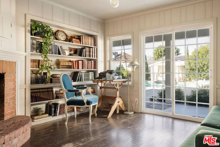 :: The Perry Farmhouse, C. 1941 :: Originally constructed as a poultry farmhouse in 1941 on 2-acres of land — today, completely unassuming behind thoughtful privacy walls, driveway gates and hedges, this exceptionally rare Dutch Colonial compound sits on an astonishing 17,000 Sq. Ft. of land and is comprised of a 3/br 2/ba rustic front house, and an additional detached, 1/br 1/ba 2-story structure. A newly painted exterior and classic brick facade, distinctive gamble roof with a double slope on each side, and a flared overhang. A masterfully curated interior pays homage to the original architecture while also benefiting from the comforts off current living standards. An oversized living room complimented by three walls of windows beam natural light, highlighting original hardwood floors, built-ins, and an original brick fireplace and mantle. A recently, fully renovated kitchen designed by Courtney Bates demonstrates that style and functionality can coexist harmoniously in a space. All new cabinetry, center island, counter tops, and hood range woodwork flow effortlessly among one another. The kitchen flows into an oversized and timeless dining room, decorated with vintage-style wainscoting and floral wallpaper, a space ideal for dinner parties and intimate nights-in alike. A main floor den accented with woodwork and a brick fireplace provides the ambiance of a countryside home office or a private sanctuary away from the main living areas. The second level of the front residence offers three bedrooms, each with its own distinct design aesthetic. The vast primary bedroom offers an abundance of natural light, while two large secondary bedrooms offer an array of living options. The upper-level bathroom features beautifully maintained original tile-work throughout – proudly displaying the original character of the home. An oversized backyard showcases an impressive swimming pool and 2-story guest house that provides a curative playground of possibilities. Open beam ceiling, concrete floors, and a farmhouse design offer a multitude of options as a creative space or secondary living options (legally permitted as a rec room on title). The second floor of the guest house offers a large bedroom, flooded by natural light, and a private deck overlooking the grounds. A sweeping, heated swimming pool and cabana flank the expansive private yard – the quintessential setting for Los Angeles living and entertaining. This private compound has also proven itself to be a lucrative rental income source, with an established rental history on Peer Space of roughly $84k annually. Other recent upgrades include new water lines and drains where remodeling took place, kitchen and dining room insulation, pool equipment and pool piping upgrades, recent termite tenting and more. A triumph of design, privacy, and rare Los Angeles architecture, the Perry Farmhouse maintains its presence as one of the city’s most unique properties.