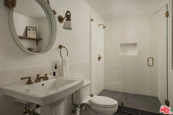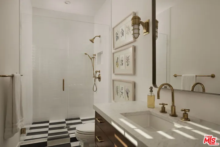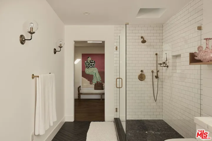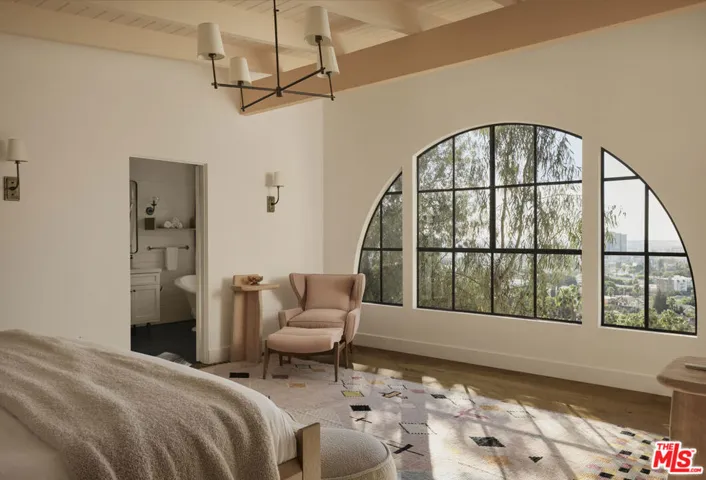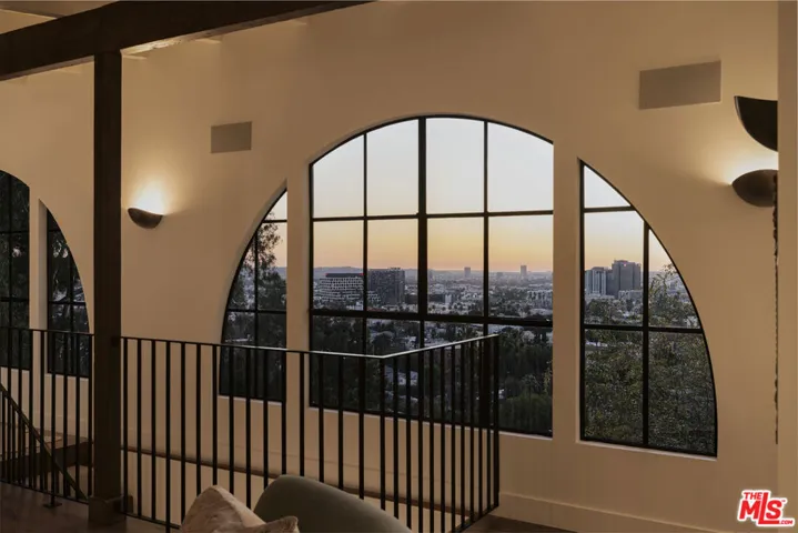 A refined and warmly modern residence in the Los Feliz Oaks, this expansive mid-century inspired estate commands sweeping jetliner views across the city. Thoughtfully designed and layered with serene sophistication, the home offers an effortless blend of contemporary comfort and timeless architectural cues. The entry level hosts two generous bedrooms, a classic hall bath, a finished, extra-large storage room, and an additional en-suite bedroom ideal for guests seeking privacy. Ascend to the main living floor, where walls of glass frame uninterrupted vistas and bathe the interiors in luminous natural light. The living room, anchored by a sculptural fireplace, echoes the clean lines and warmth of mid-century design and flows seamlessly into a dining area with custom bay-window seating and statement lighting. Also providing access to an outdoor lounge area. The kitchen features an oversized center island, a breakfast nook, and abundant custom storage, all opening to a cozy family room with city views, a guest bath, and a laundry room. The primary suite functions as a tranquil, hotel-inspired retreat: a fireside sitting area opens directly to the outdoors, while the spa bathroom offers a soaking tub perfectly positioned to capture cinematic views and ethereal light throughout the day. A custom extra-large dressing room with a custom vanity provides a beautifully curated space for wardrobe and accessories. The lower-level garage conversion creates an inspiring studio workspace with bespoke built-ins and accordion glass doors that dissolve the boundary between indoors and out. The grounds unfold across multiple terraces, providing distinct environments for recreation, creativity, and large scale entertaining. A dedicated studio adjacent to the thriving vegetable and herb garden is ideal for pottery, greenhouse use, or children’s activities. Additional outdoor amenities include a grassy side yard, a dining terrace, a sun deck with an outdoor shower, and a vibrant orchard woven into the mature hillside landscape. At the estate’s uppermost level, a dramatic pergola-topped entertaining deck with a complete outdoor kitchen and bar. This deck showcases unforgettable sunsets and panoramic city views. Privately positioned at the end of a cul-de-sac and elevated well above the street, this exceptional retreat embodies the elegance, privacy, and enduring allure of California living.